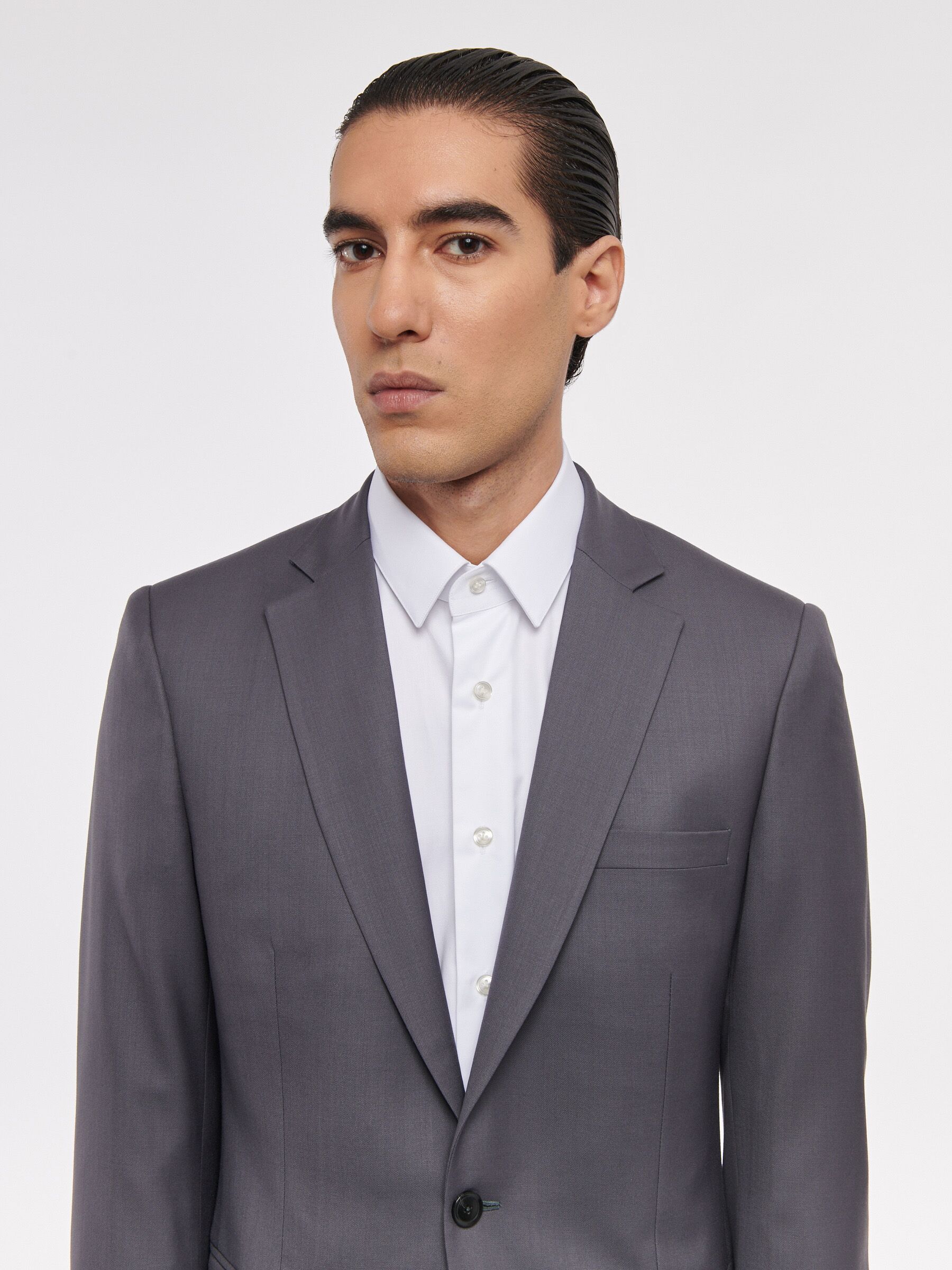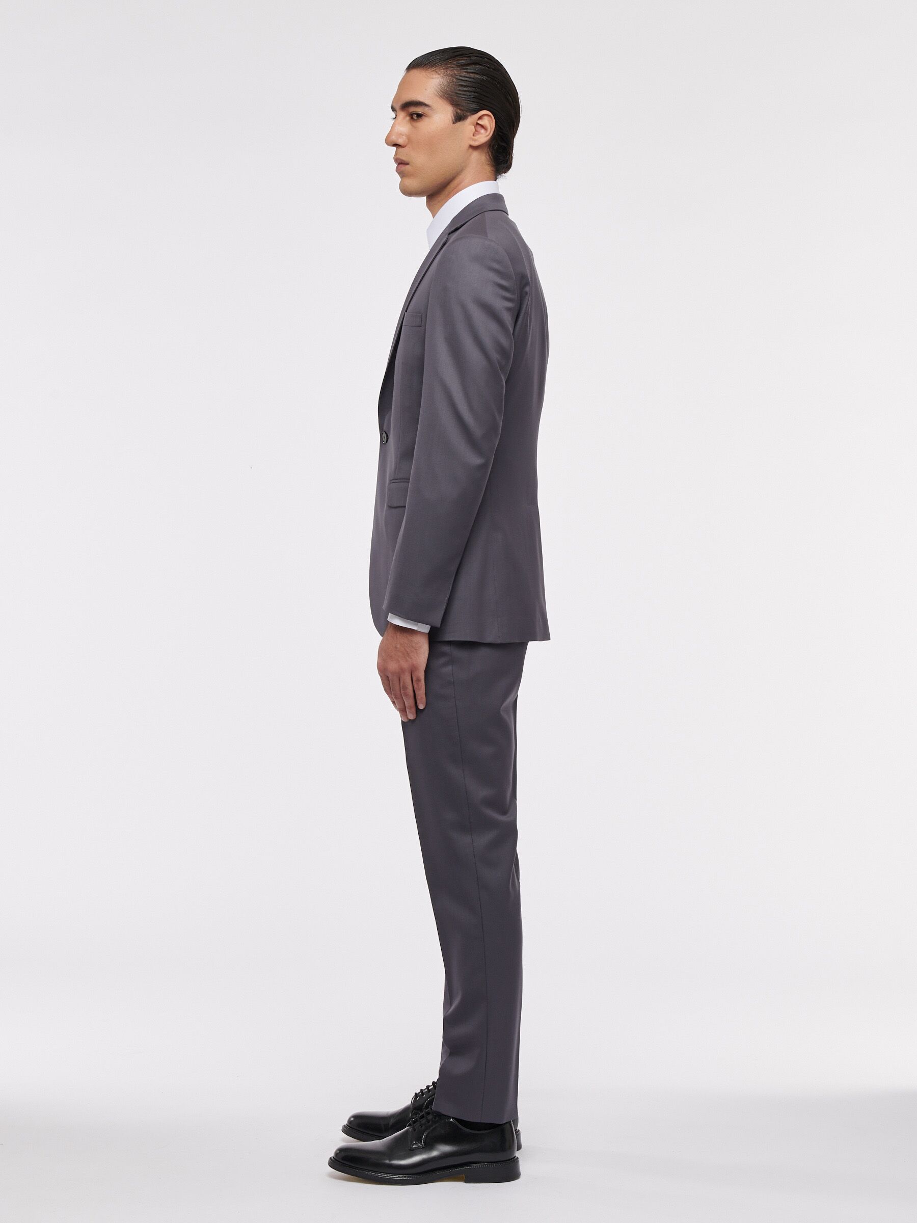 SERGÉ DE LAINE AU TISSAGE DENSE ET RICHE QUI DONNE À LA COULEUR GRISE CET ASPECT PLEIN, LISSE.