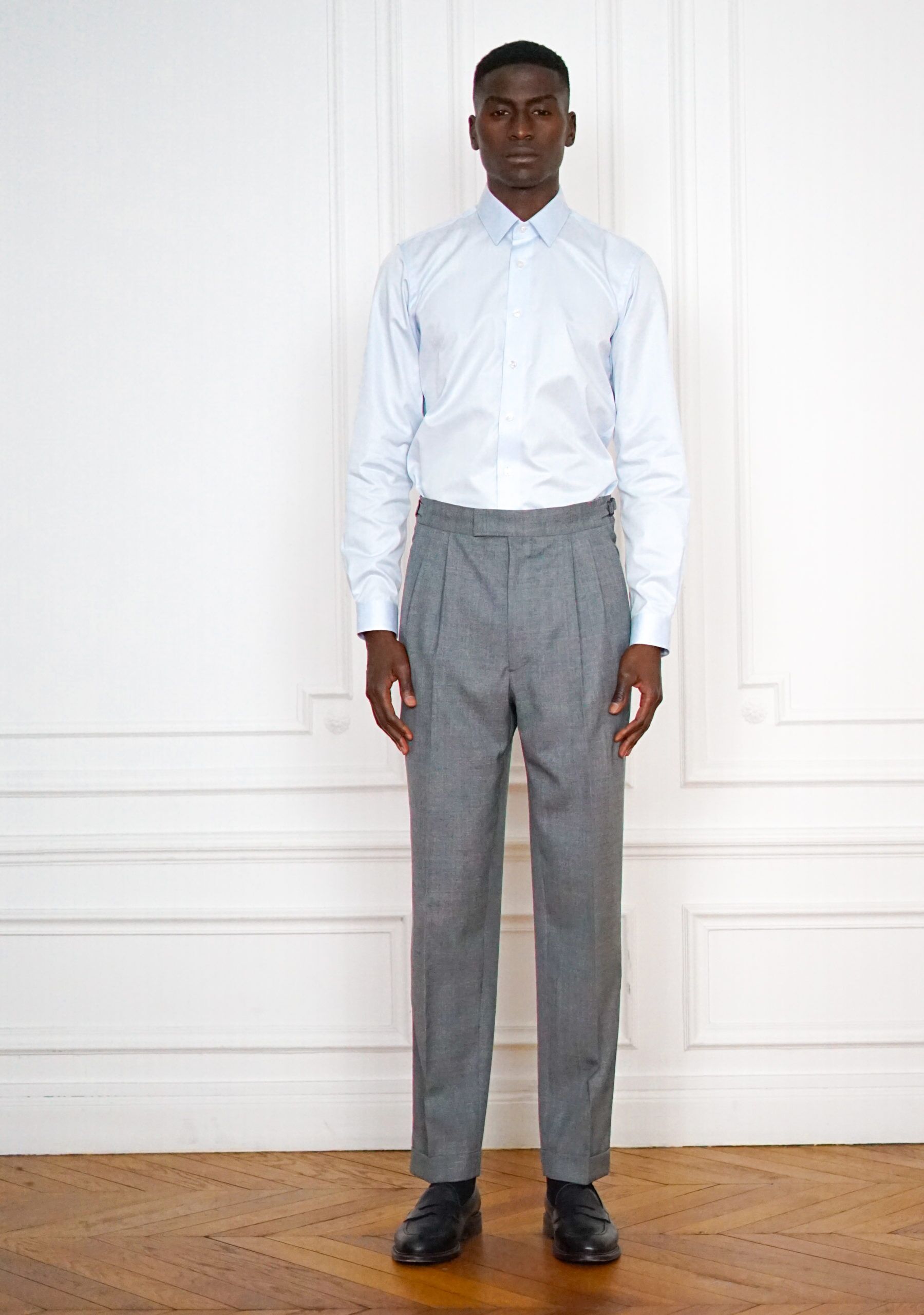 Chemise business bleu pâle, ajustée, réalisée en twill de coton. Col français. Boutons en nacre blanche cousus en patte d’oie et hirondelles cousues à la main.