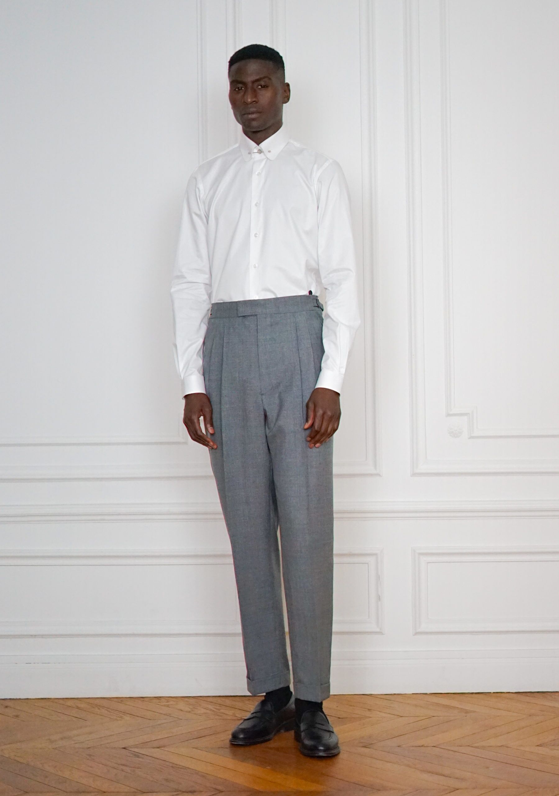 Chemise business blanche “pin collar”, ajustée, réalisée en twill de coton. Col français. Boutons en nacre blanche cousus en patte d’oie.