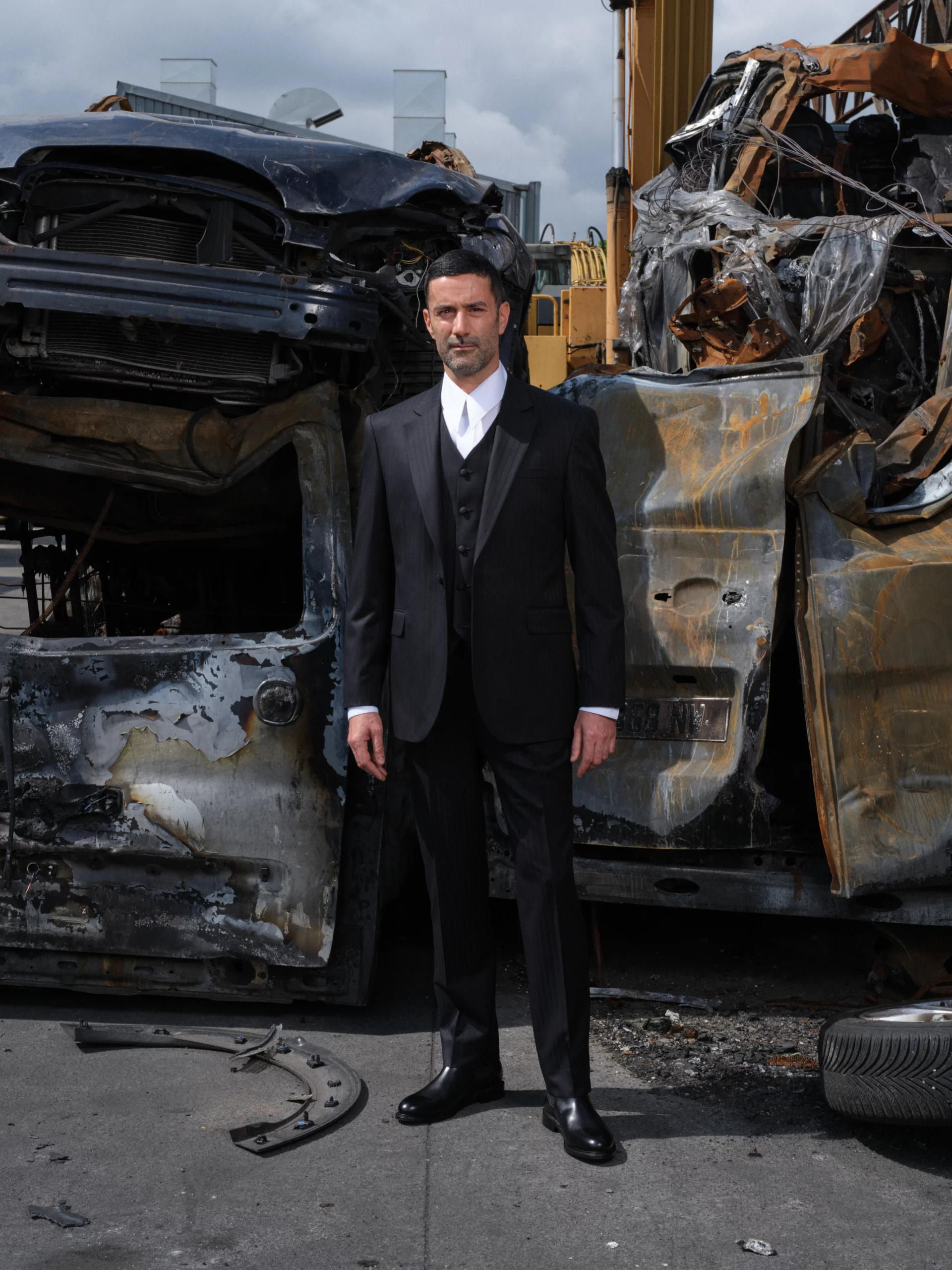 Veste droite, 1 bouton, col classique à crans de 9cm, poches à rabats. Gilet droit à boutonnage haut, bas en pointes. Pantalon taille haute, coupe droite, bas fini simple. Tissu italien en laine sergée glacée, noir à rayures ton sur ton.