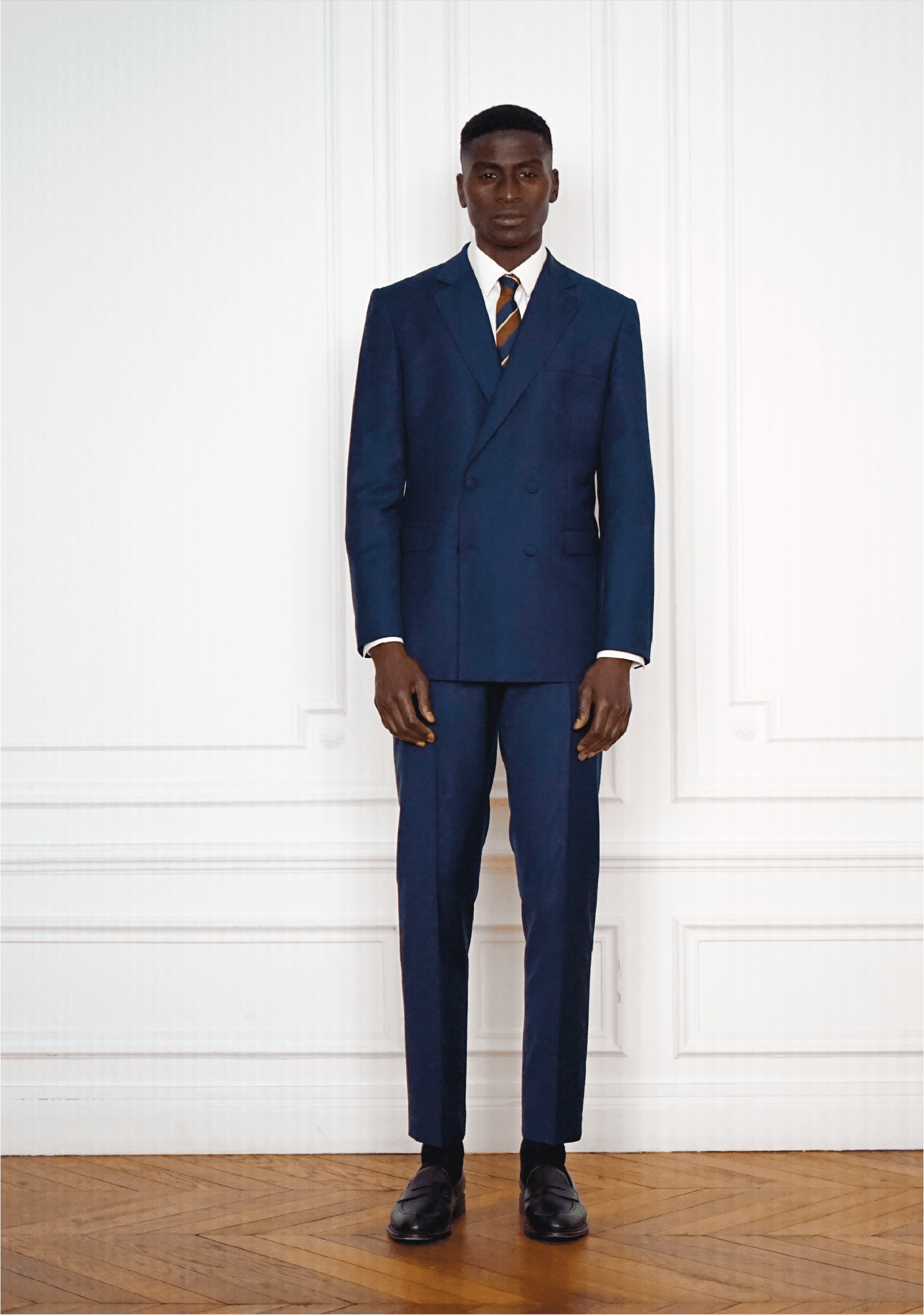 Costume croisé bleu marine, réalisé dans un précieux sergé de laine australienne (Loro Piana). Veste croisée 4 boutons, cintrée à la taille. Pantalon fuselé.