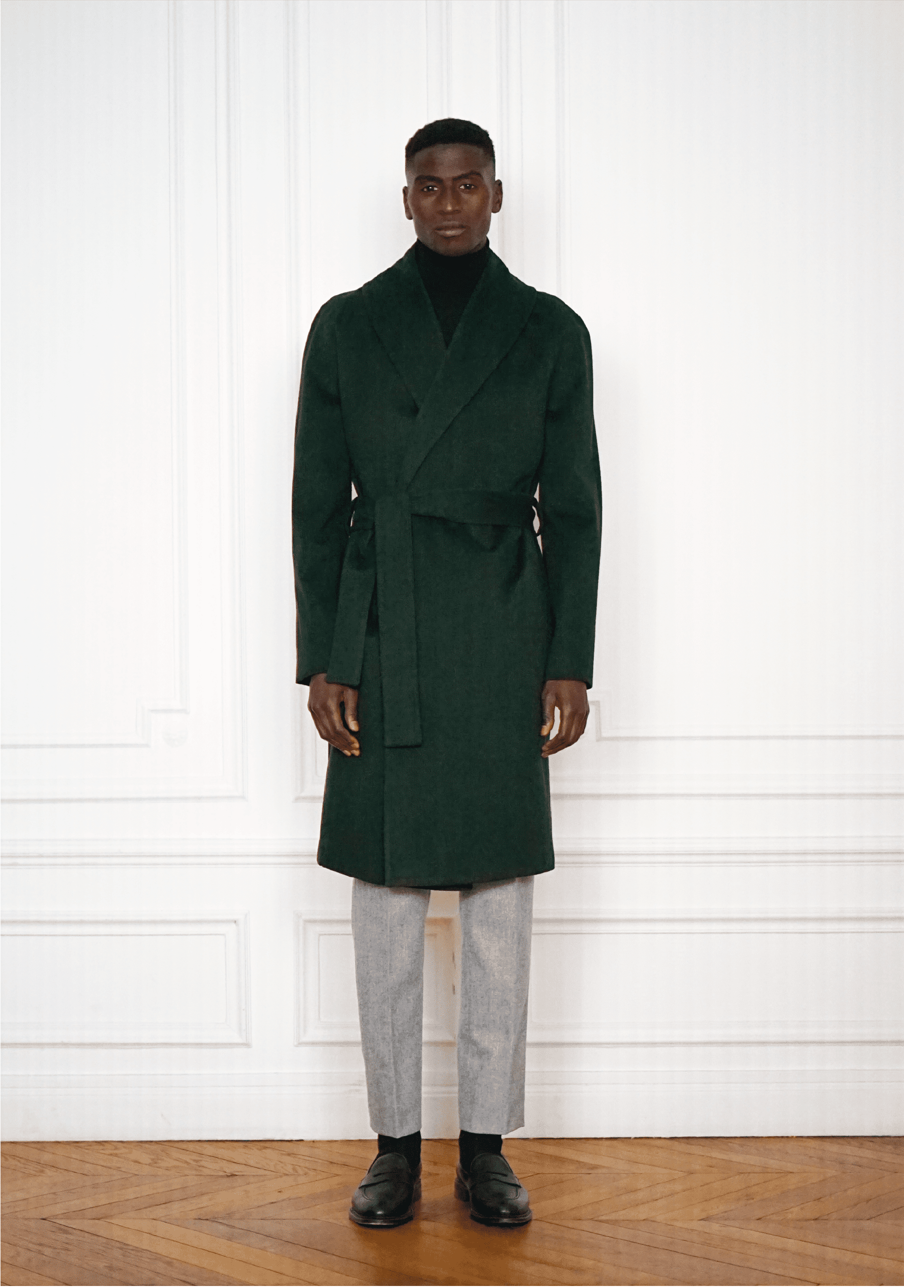 Manteau peignoir en laine et cachemire vert. Col châle. Poches dans la couture. Pas de boutons manches. Ceinturé à la taille.