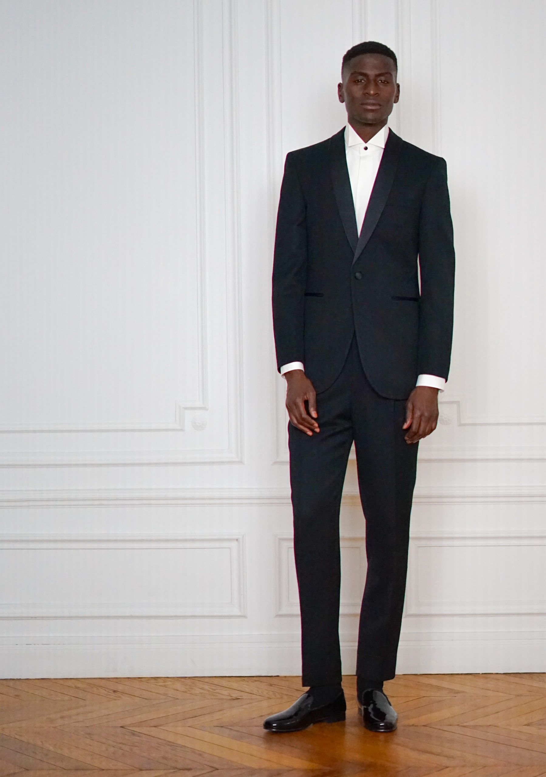 Smoking noir en laine barathéa, à col châle en satin de soie. Veste droite. Col châle et poches passepoilées en satin. Pantalon fuselé. Ceinture en satin de soie.