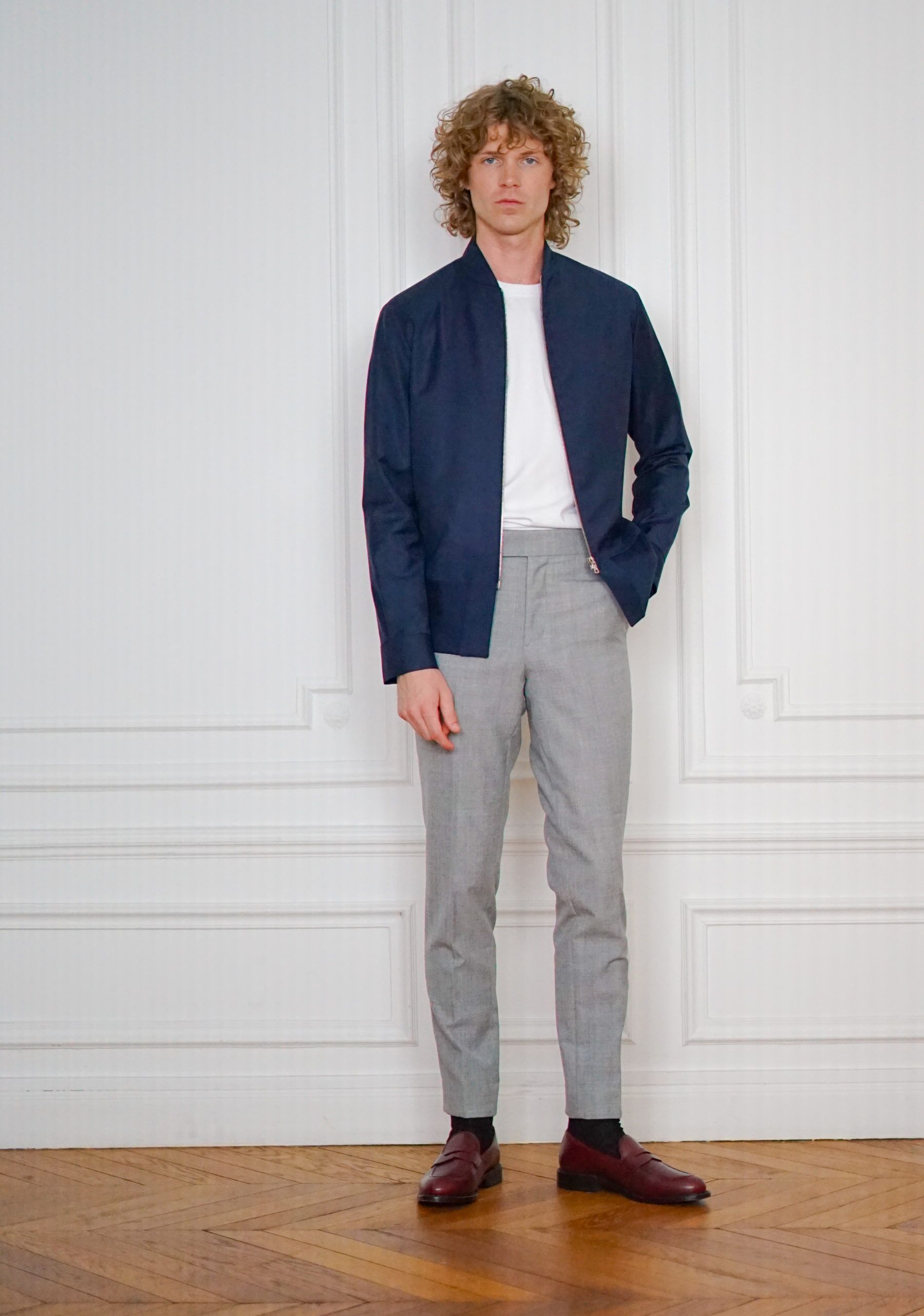 Veste bomber bleu marine, réalisée dans un sergé de laine. Veste droite. Col bomber. Épaules tailleur. Fermeture zip riri.