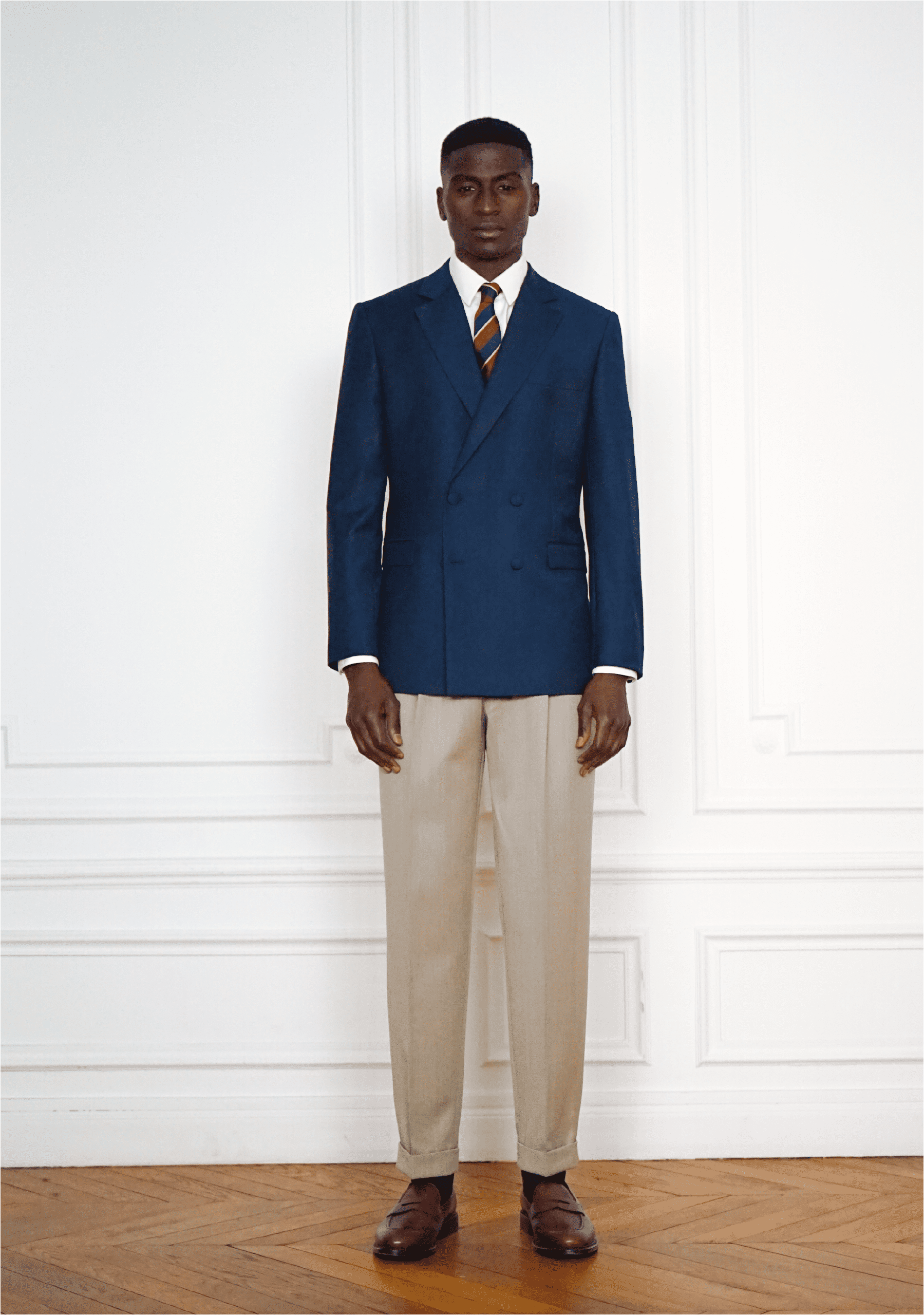Veste croisée bleu marine, réalisée dans une précieuse laine australienne (Loro Piana). Veste croisée 4 boutons, cintrée à la taille. Col à crans 8cm.
