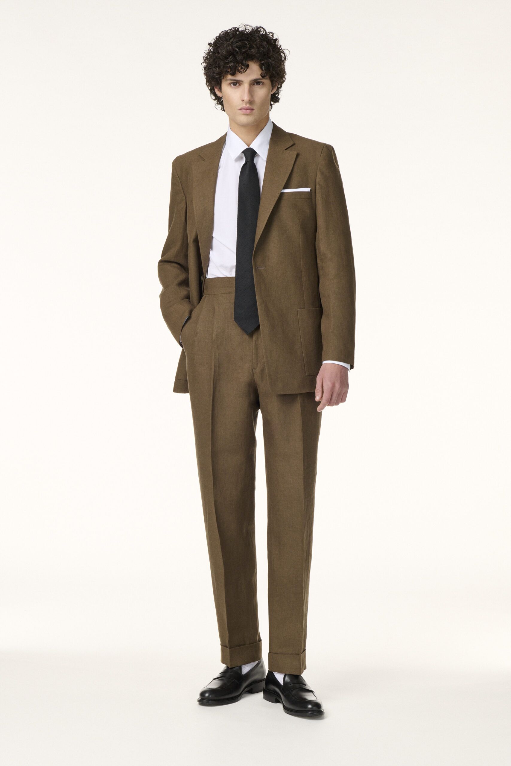 Costume droit en lin italien. Veste déstructurée, col à crans 9cm, bouton en corne, poches plaquées. Pantalon taille haute, double pinces, revers 5cm.