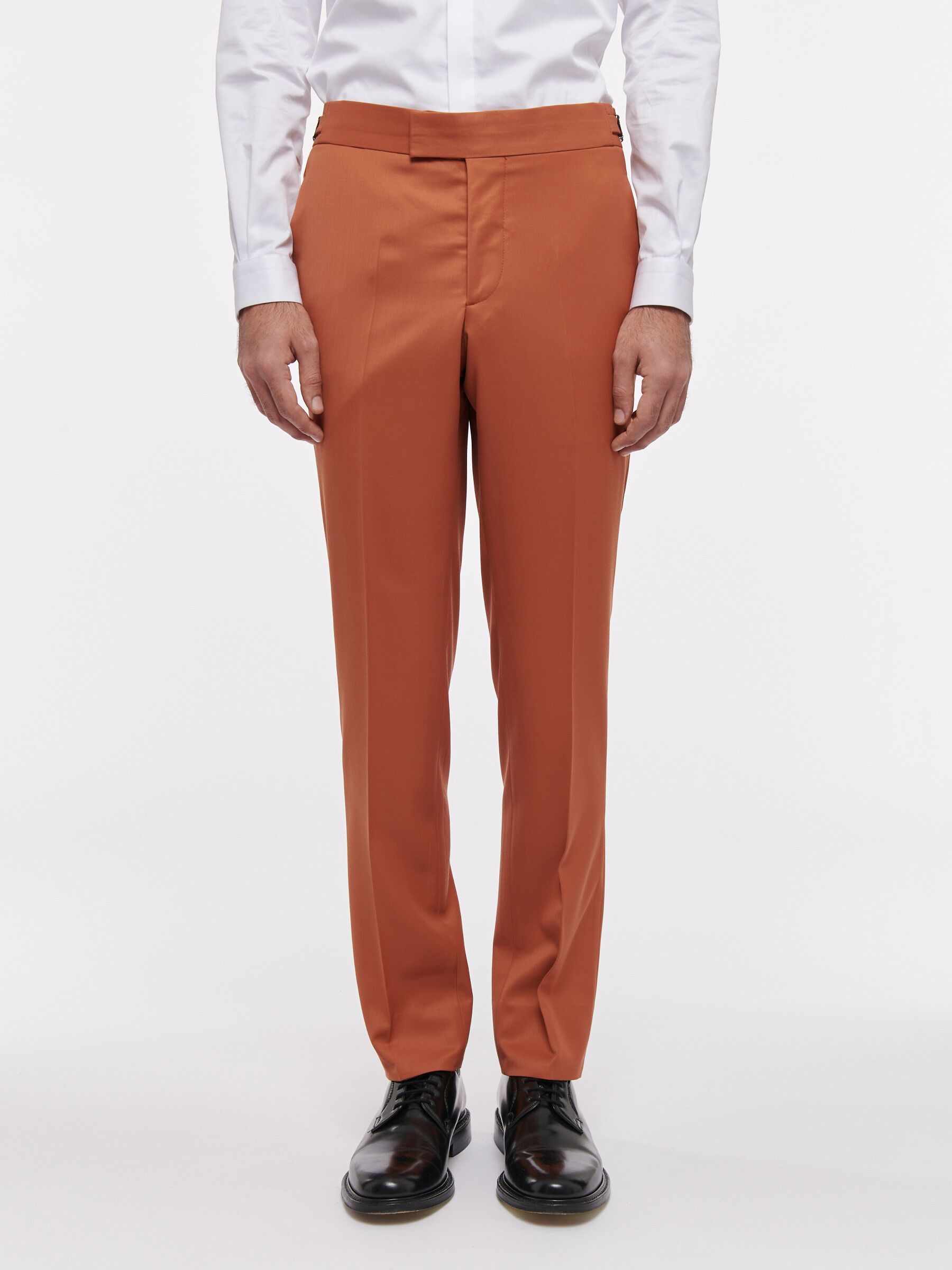 HIGH-WEIGHT WOOL GARBARDINE FOR A PERFECT SILHOUETTE. A TERRA COTTA SHADE WITH OCHRE UNDERTONES.