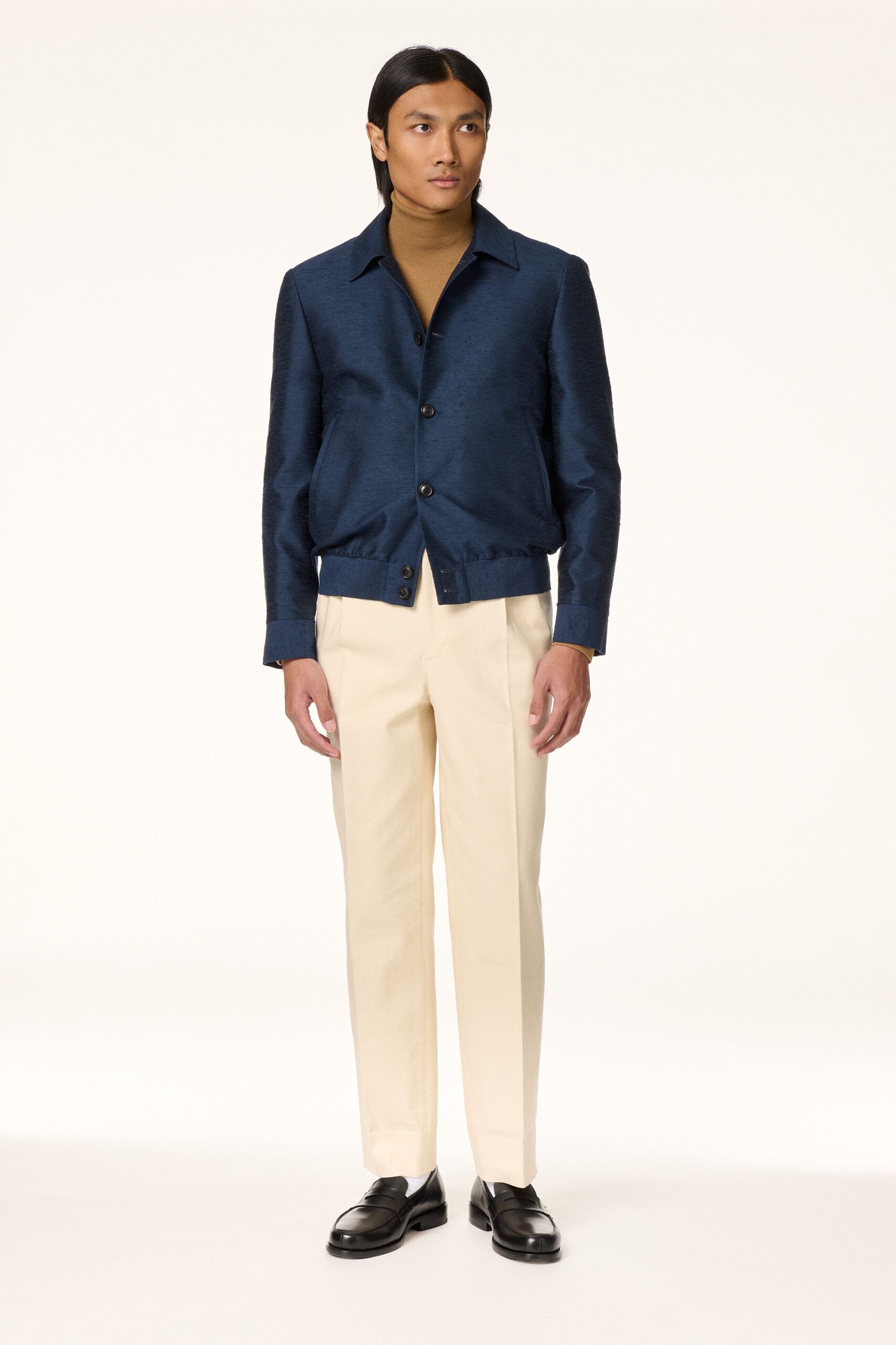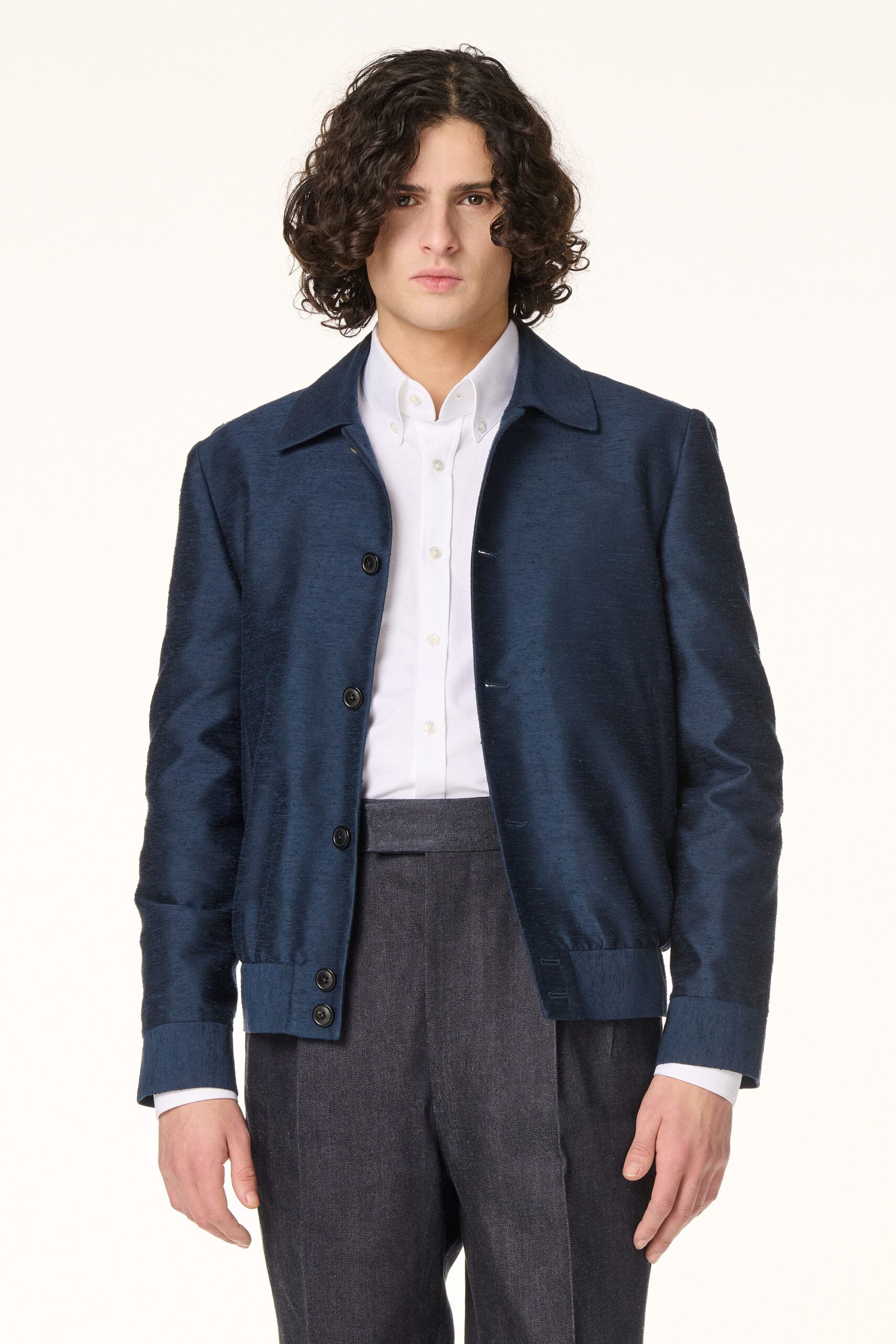 Blouson réalisé dans un shantung de soie italien à la teinte bleu marine.