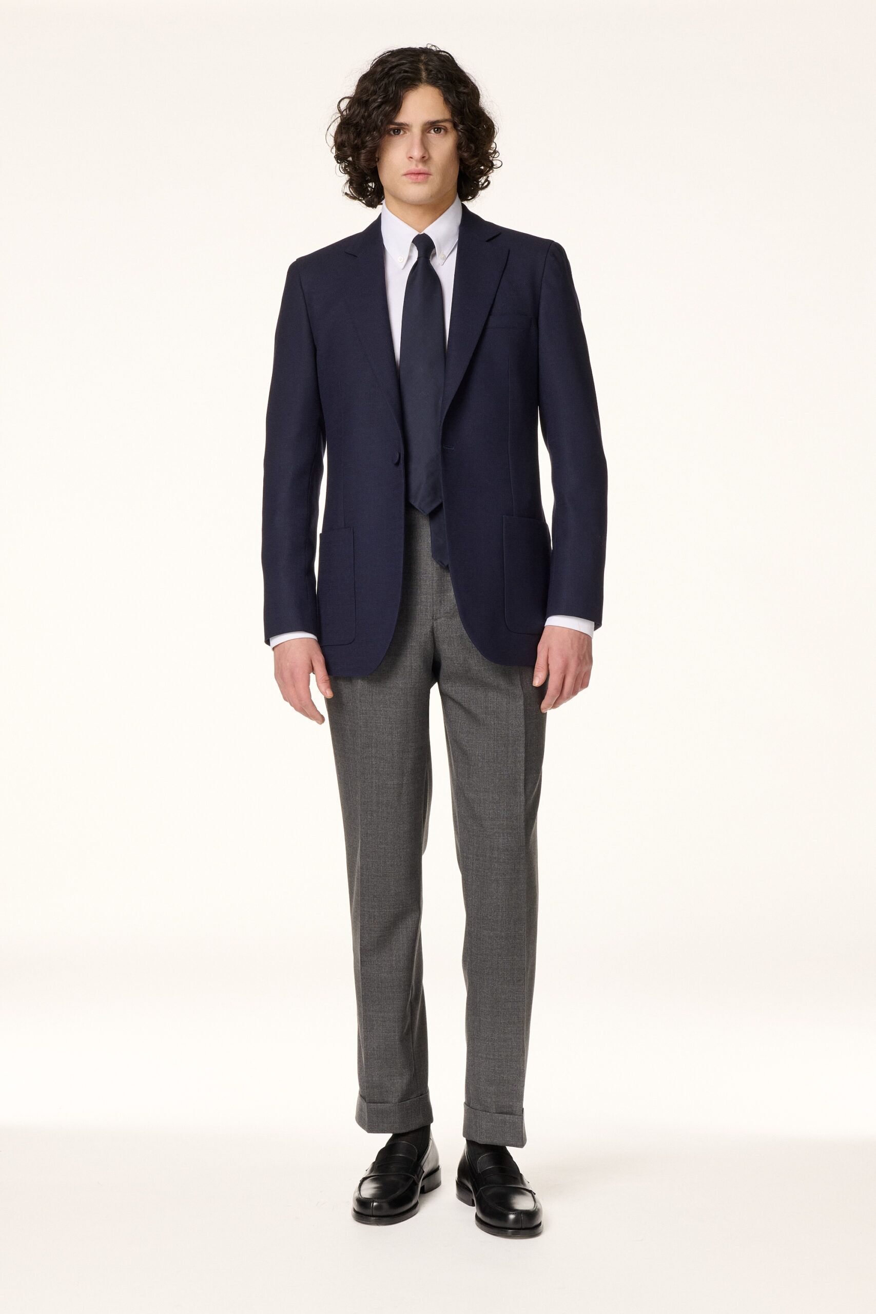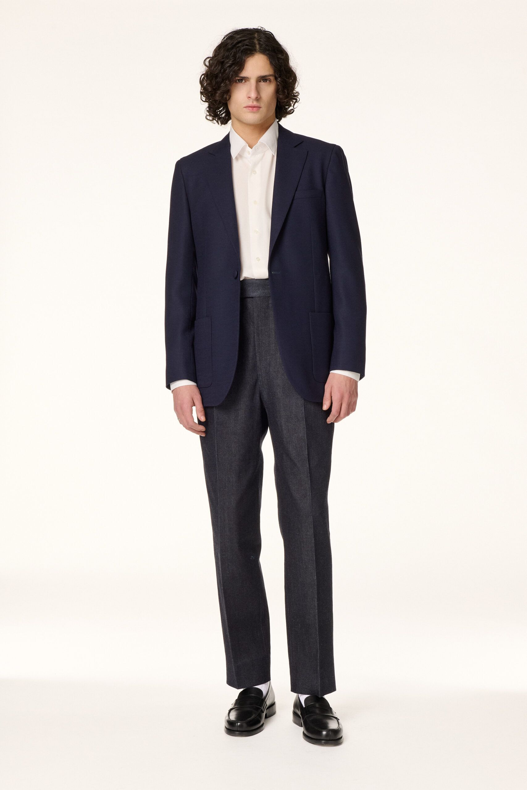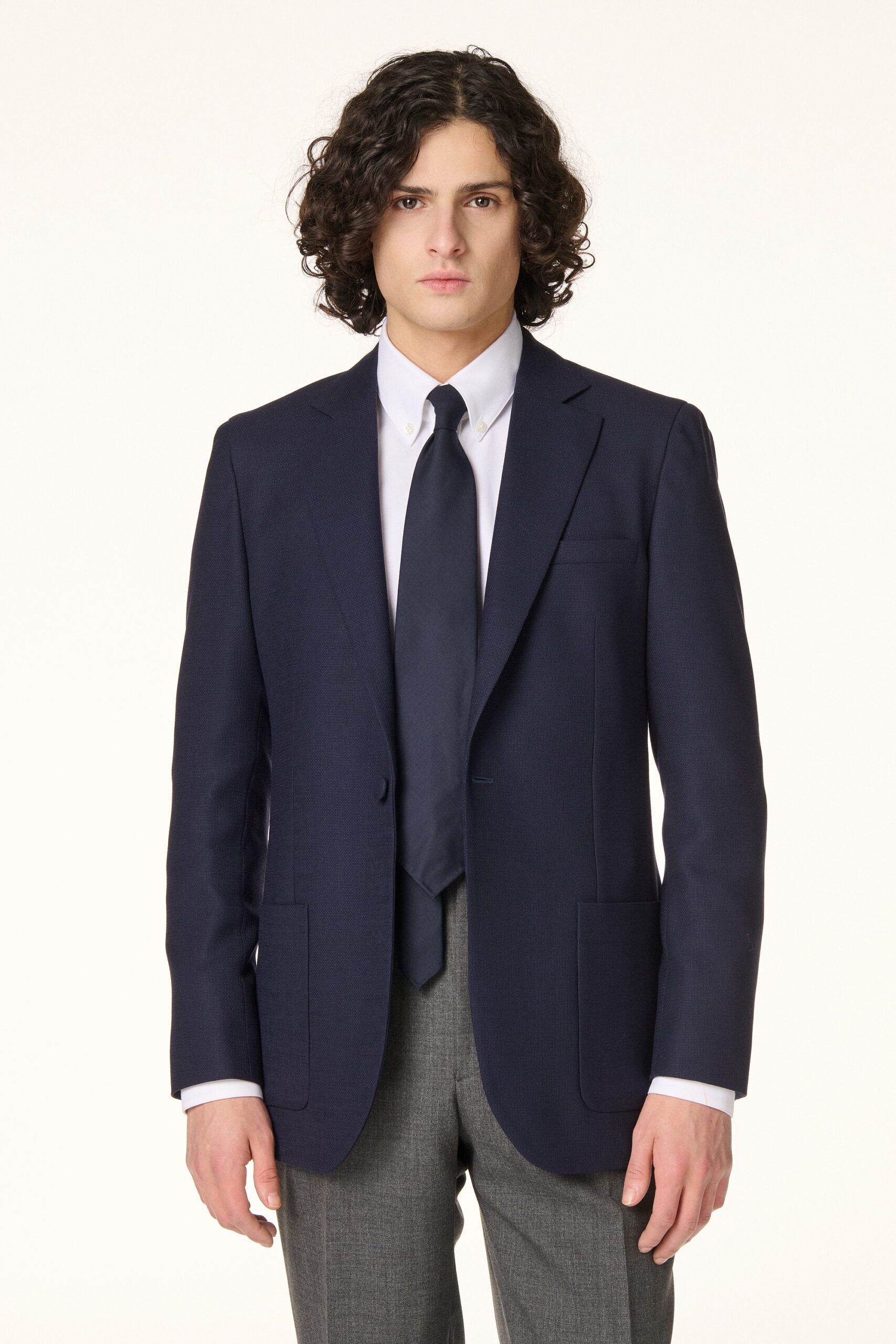Straight jacket crafted from a navy blue Italian wool basketweave. Designed to be worn all year round, unstructured and unlined, it features a Neapolitan shoulder, a classic notched lapel of 9 cm, a closure with a fabric covered button and patch pockets.