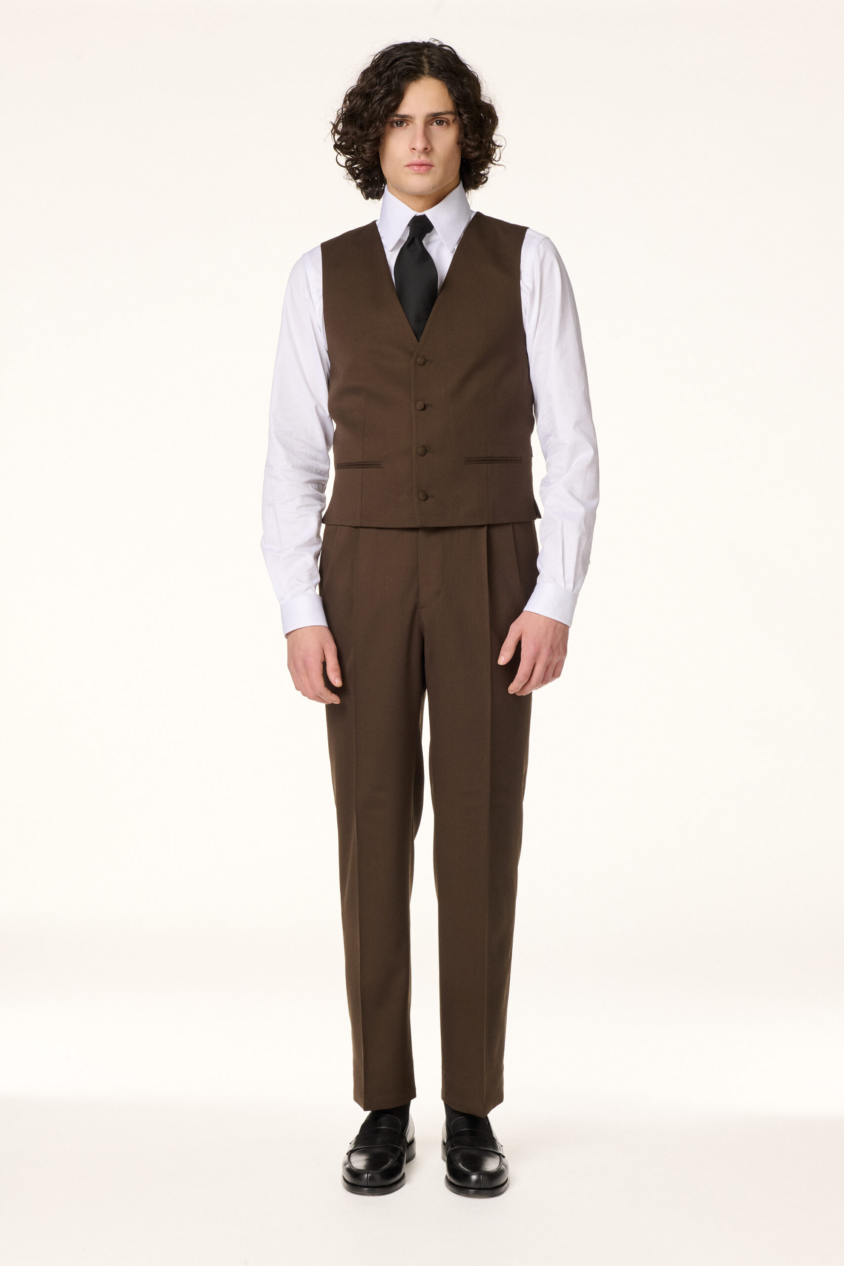 Costume 3 pièces réalisé dans une serge de laine marron foncé. Conçu pour être porté toute l’année, il se compose d’une veste droite à la coupe confortable, fermée par un bouton en tissu, un col classique à crans de 9 cm et des poches à rabats. Un gilet à décolleté en V et à bas droit. Le pantalon taille haute, à double pinces, se termes par un bas fini simple.