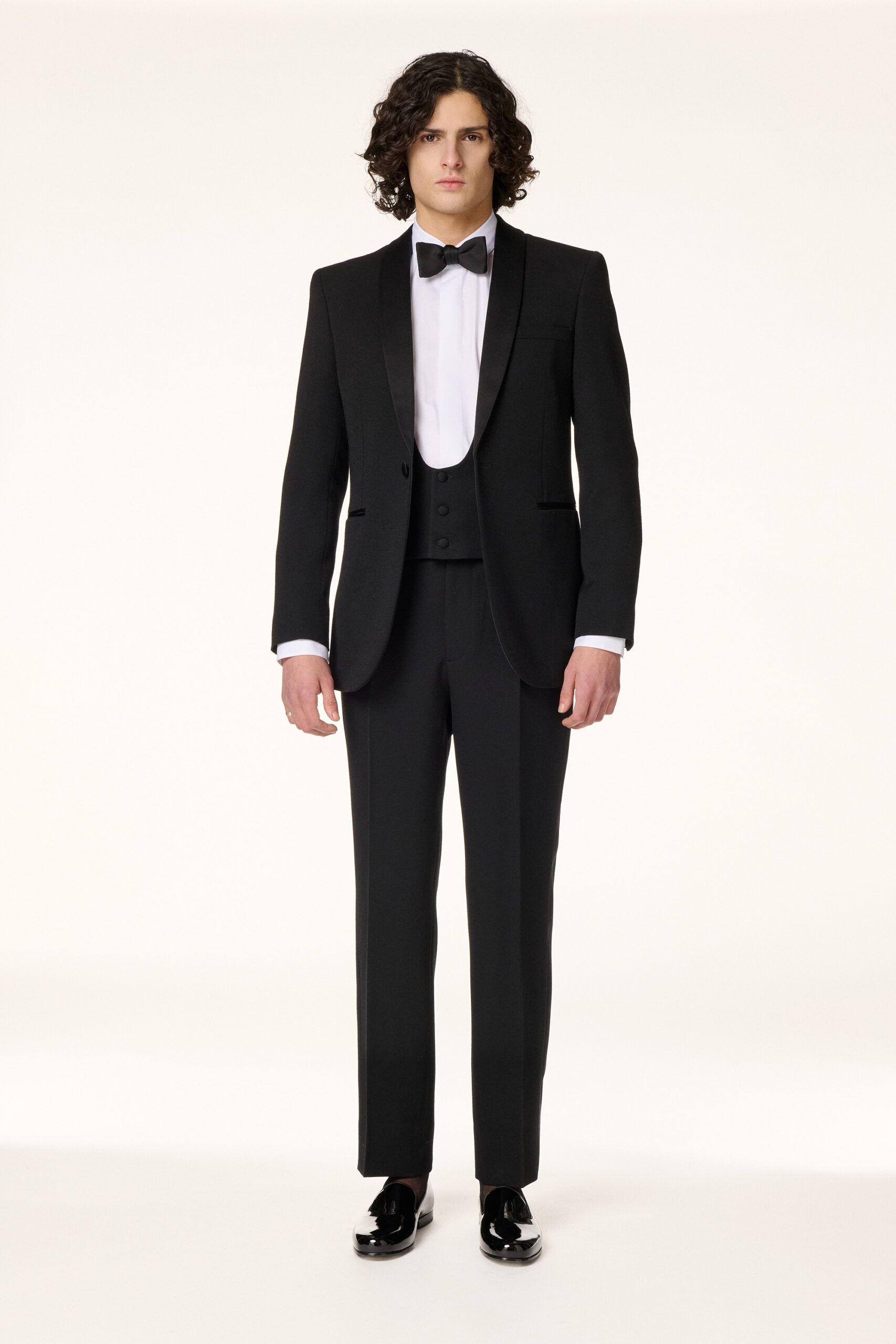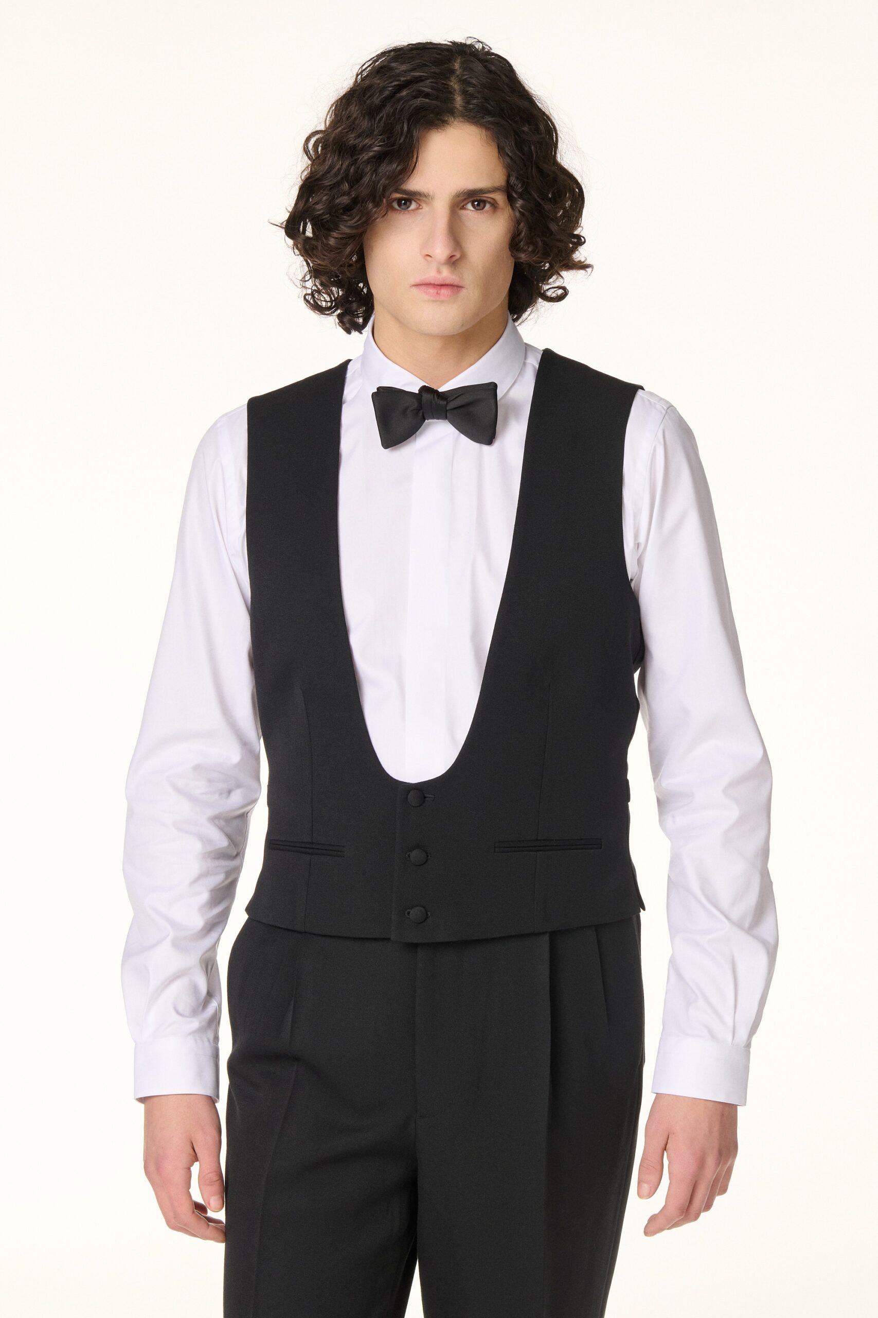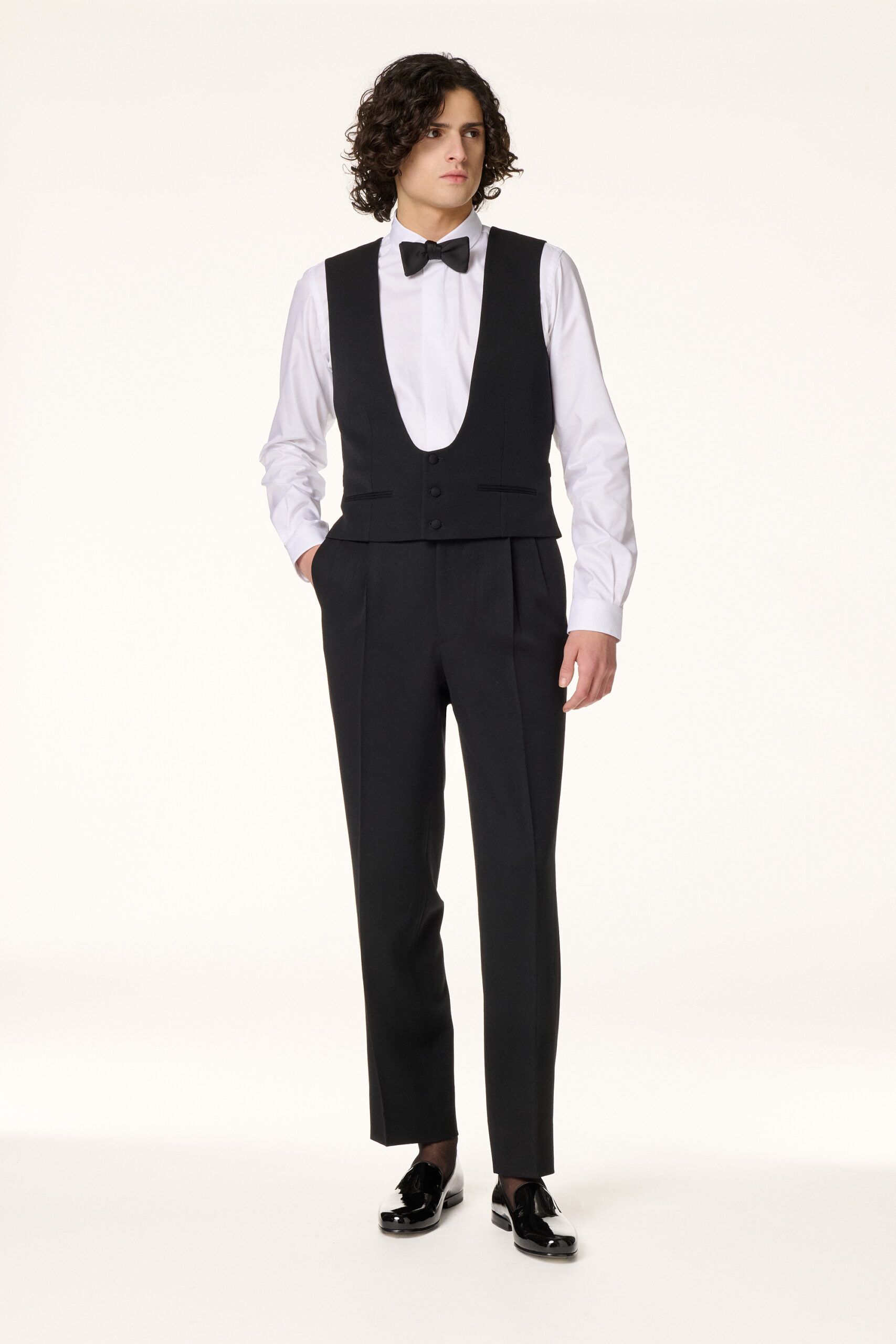 Gilet de smoking noir réalisé dans une laine barathéa noire. Il présente une encolure échancrée, un bas droit et un dos confectionné dans la même matière.