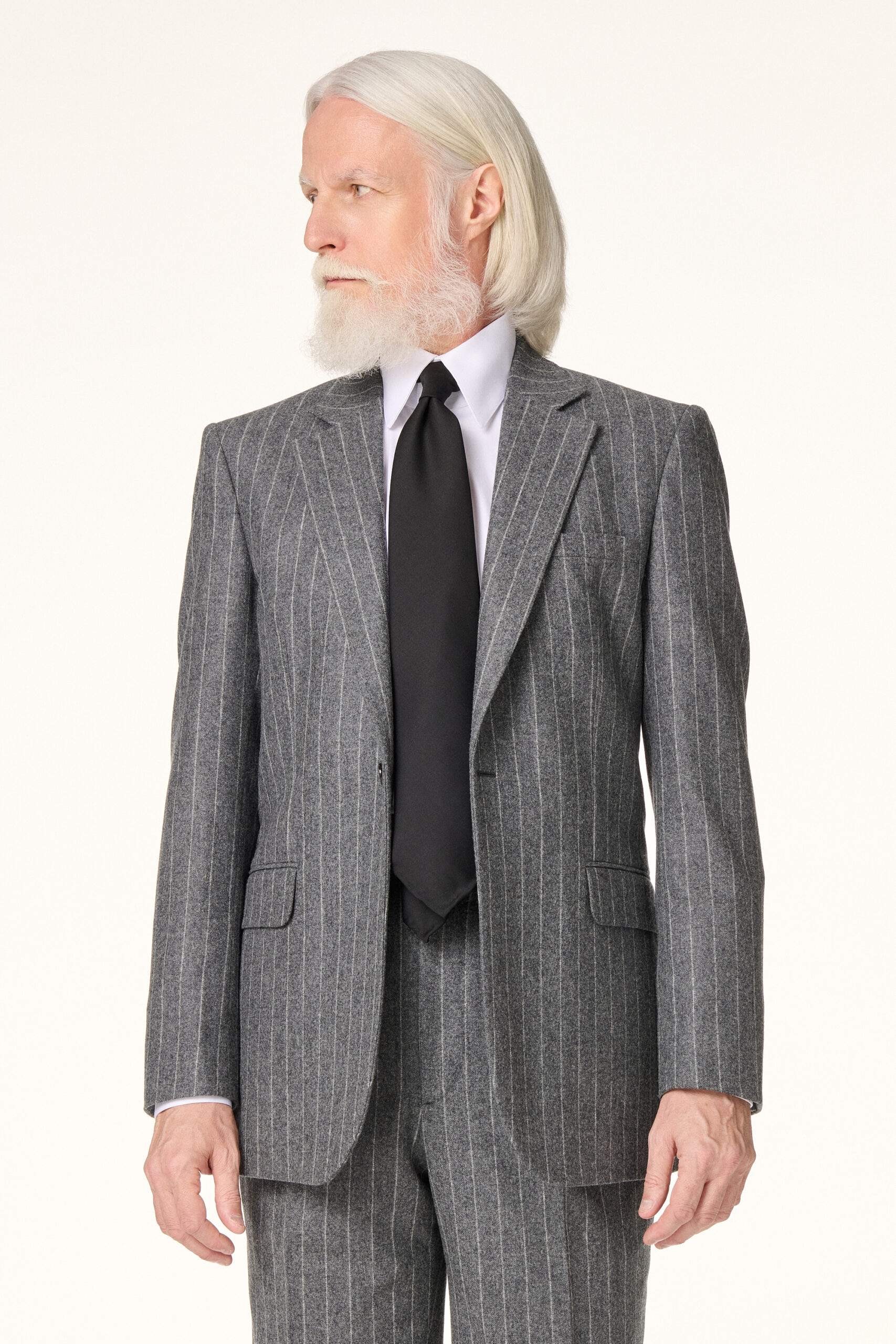 Suit crafted from a mid-grey wool flannel with chalk stripes. Designed for autumn winter, it consists of a straight Jacket closed by 1 horn button, classic notched lapel of 9cm and flap pockets. The high-waisted, double-pleated trousers are finished with a 5cm cuff.