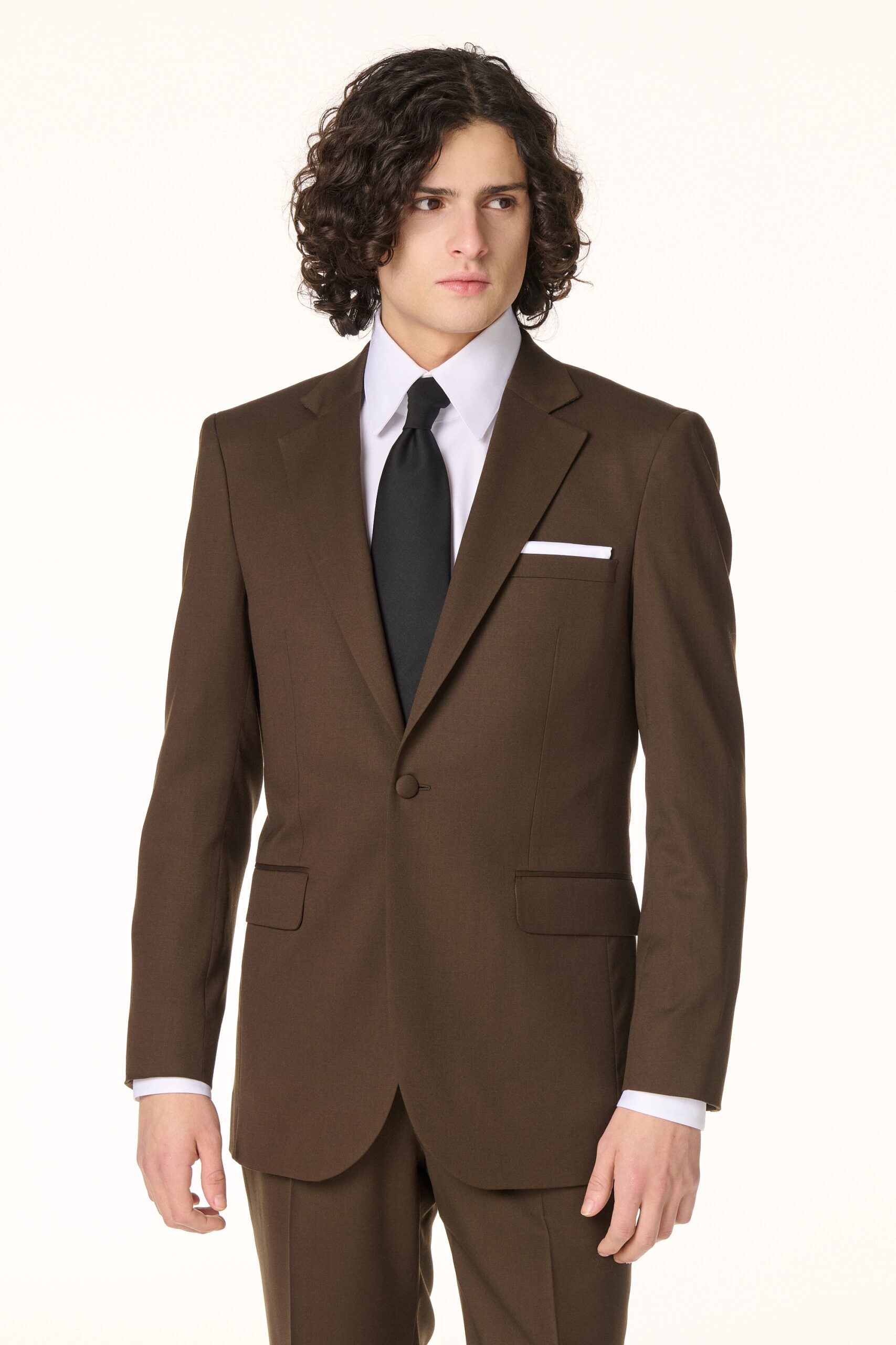 Veste de costume réalisée dans une serge de laine marron foncé. Conçue pour être portée toute l’année, elle présente une coupe droite confortable, une fermeture par bouton recouvert de tissu, un col classique à crans de 9 cm et des poches à rabats.