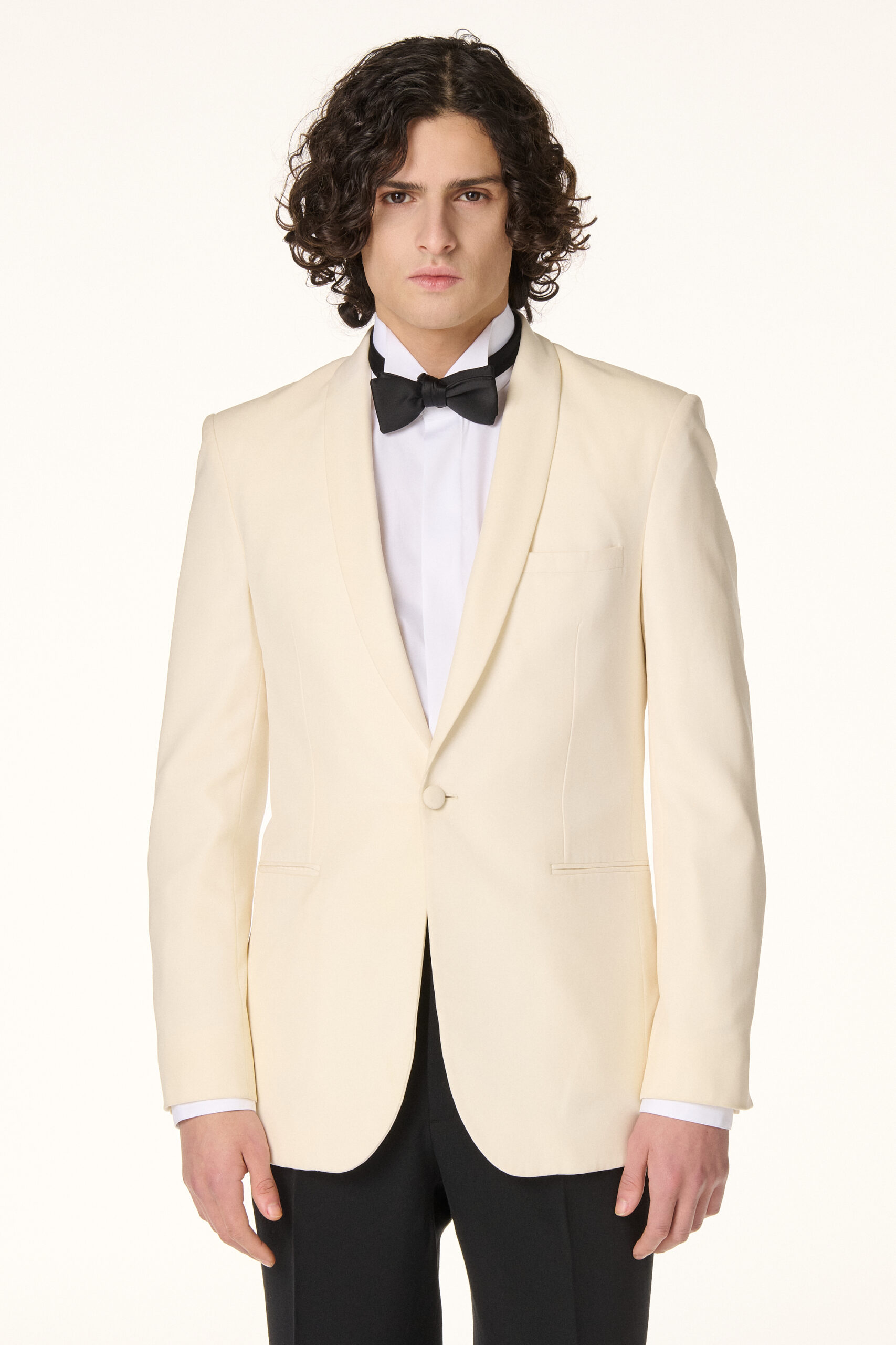 Tuxedo jacket crafted from a precious off-white wool serge. Straight cut, closed by a fabric covered button, it features a rolled shawl collar and welt pockets.