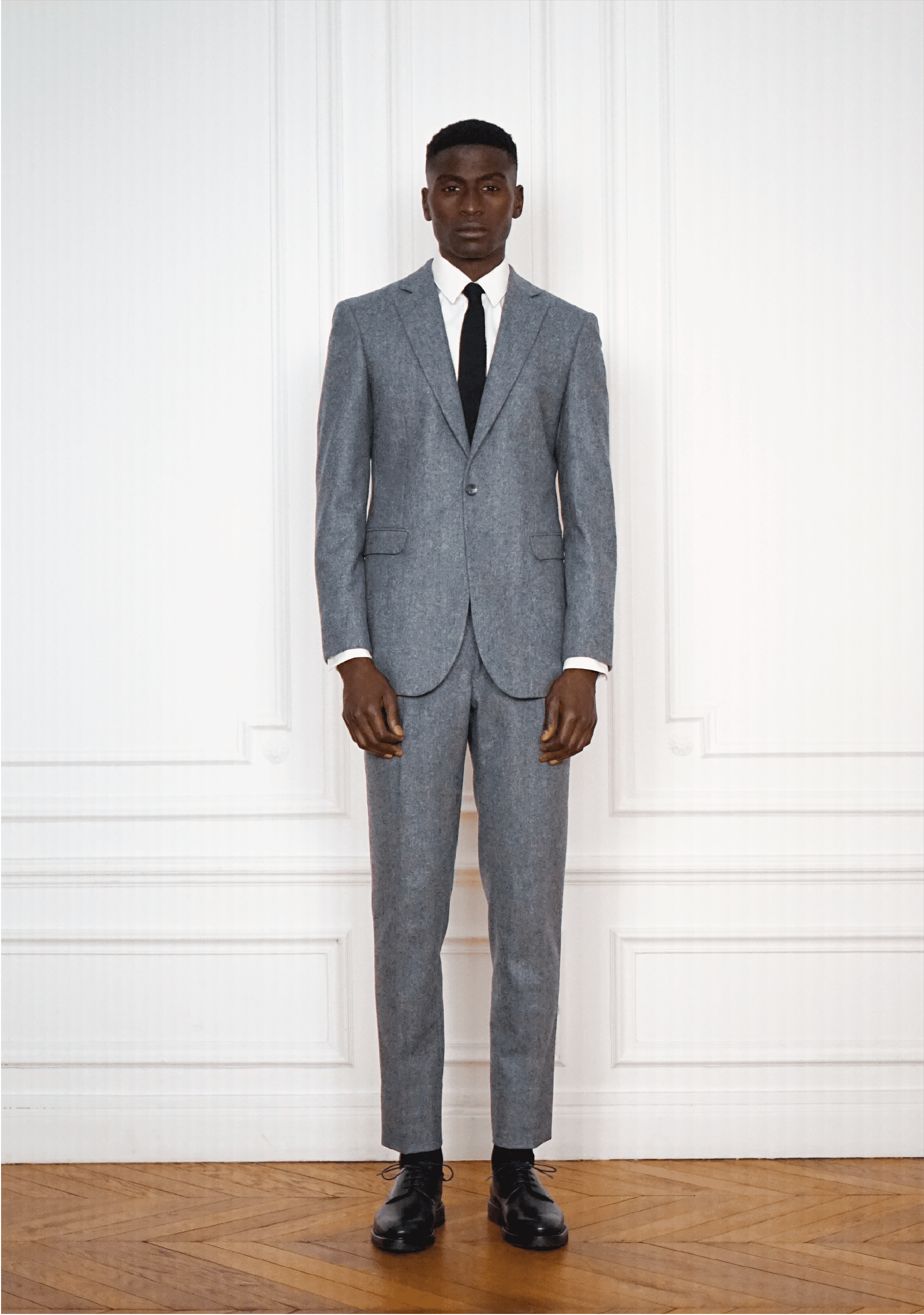 Medium Grey flannel suit. Single-breasted jacket, fitted at the waist. High-waisted trousers, double-pleated, tapered leg.