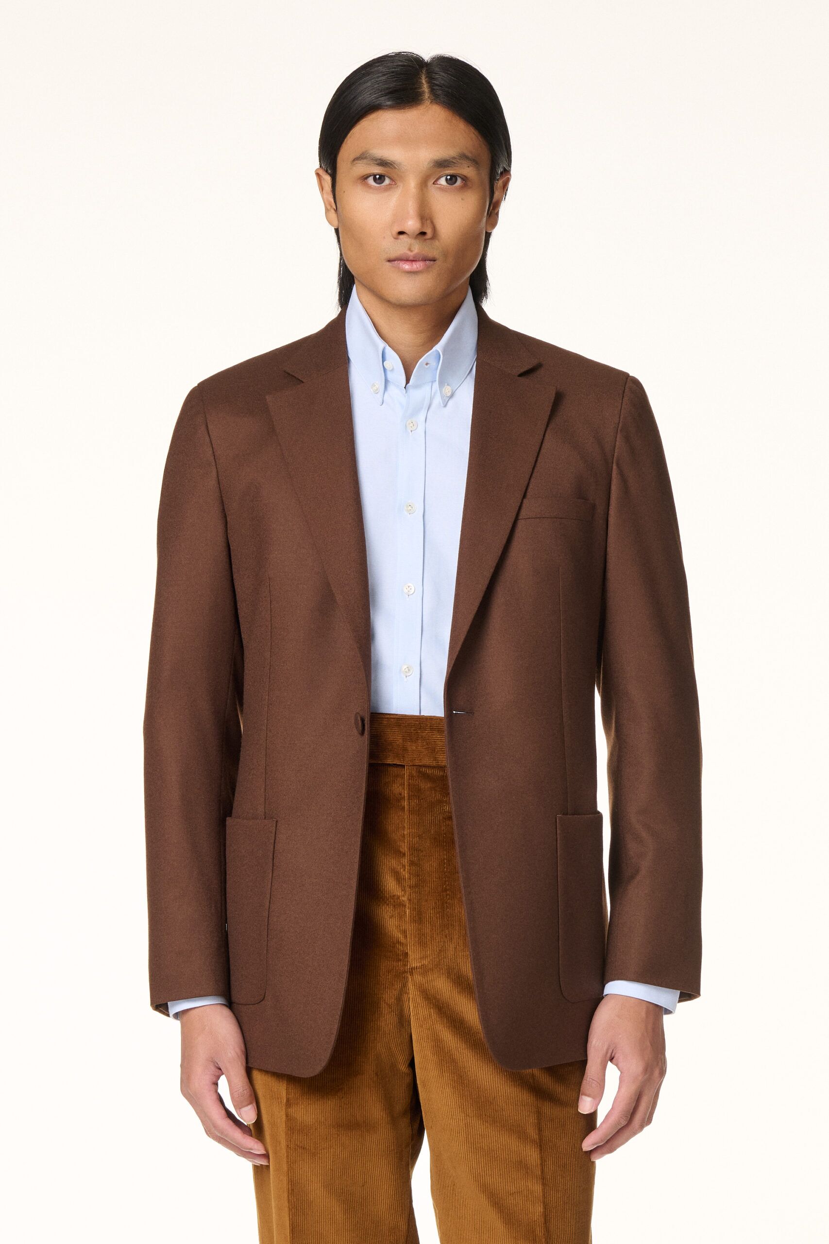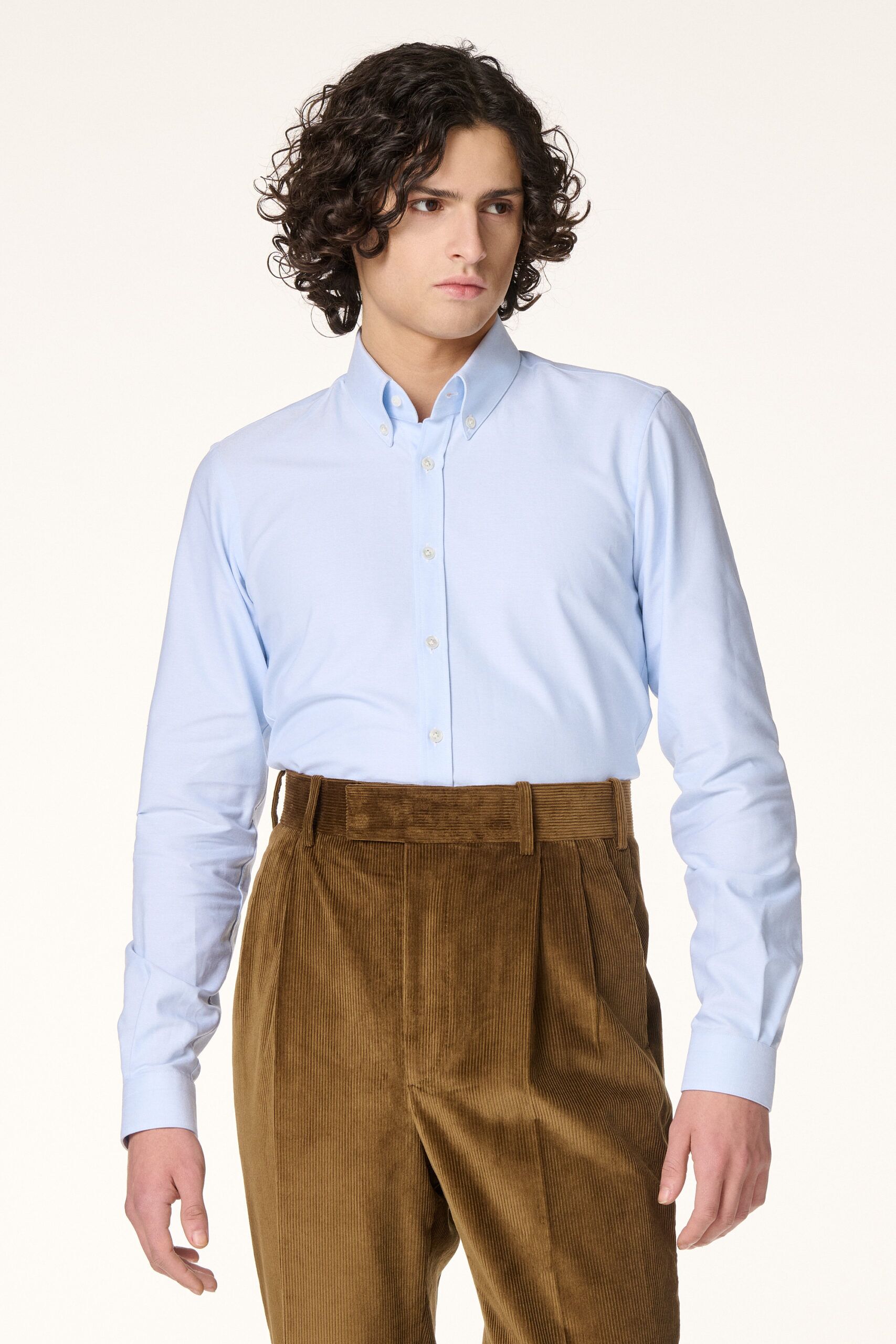 Chemise décontractée “button down” bleue, réalisée dans un tissu oxford brushed. Boutons en nacre blanche cousus en patte d’oie et hirondelles cousues à la main.