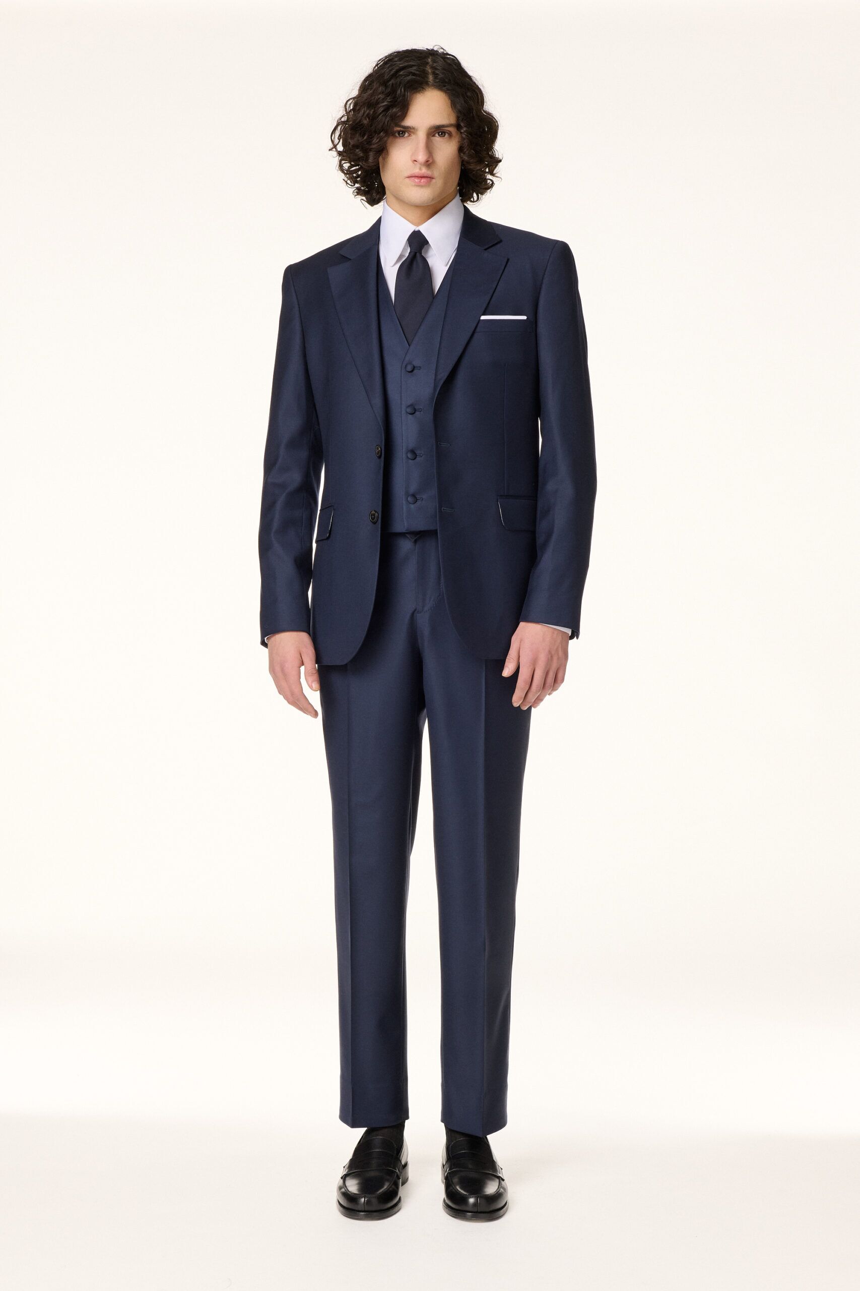 Costume trois pièces réalisé dans une serge de laine bleu marine. Conçu pour être porté toute l’année, il se compose d’une veste droite à la coupe confortable, fermée par deux boutons en corne, avec un col classique à crans de 9 cm et des poches à rabats. Un gilet avec encolure en V à bas droit. Le pantalon, taille haute, coupe droite.