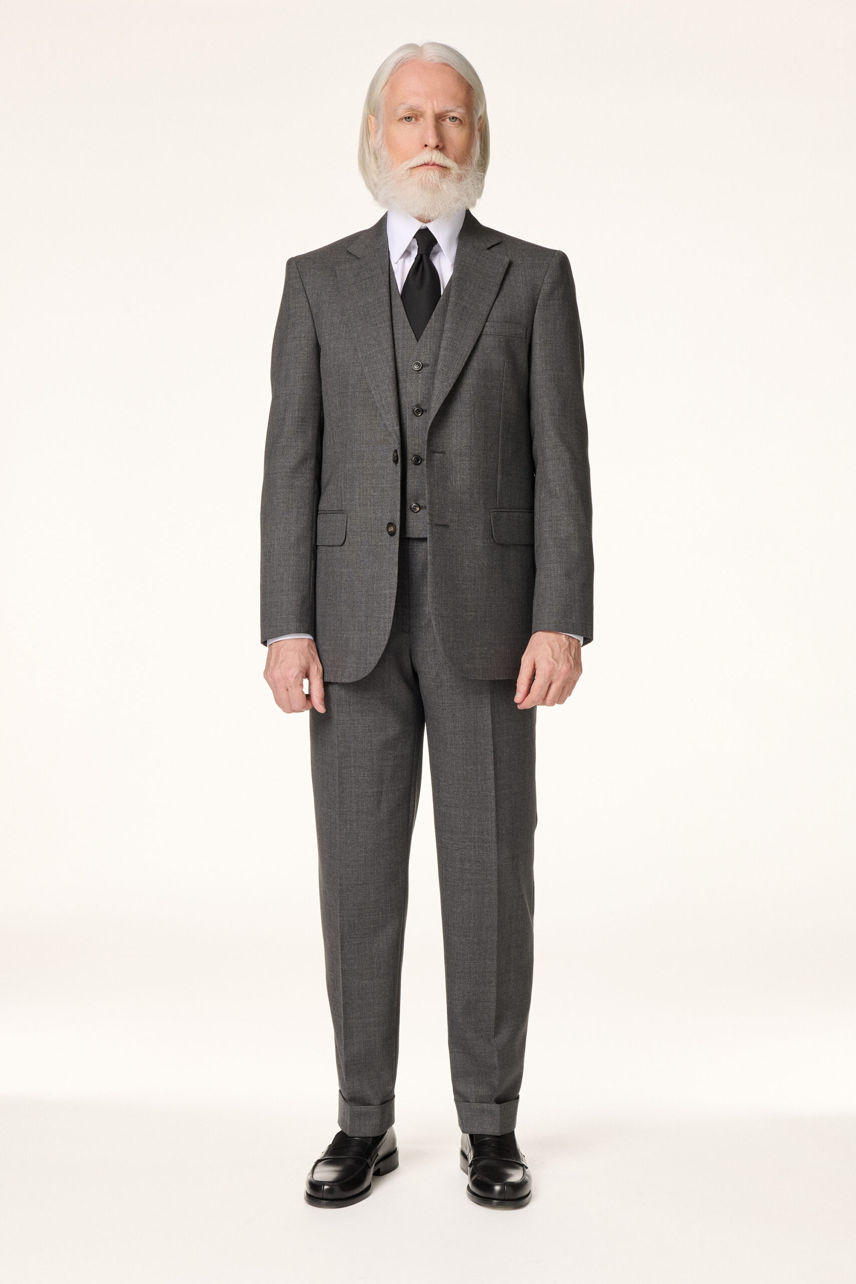 Costume trois pièces réalisé dans une laine froide gris moyen. Conçu pour être porté toute l’année, il se compose d’une veste droite à la coupe confortable, fermée par deux boutons en corne, avec un col classique à crans de 9 cm et des poches à rabats. Un gilet avec encolure en V à bas droit. Le pantalon, taille haute, à double pinces, se termine par un revers de 5cm.