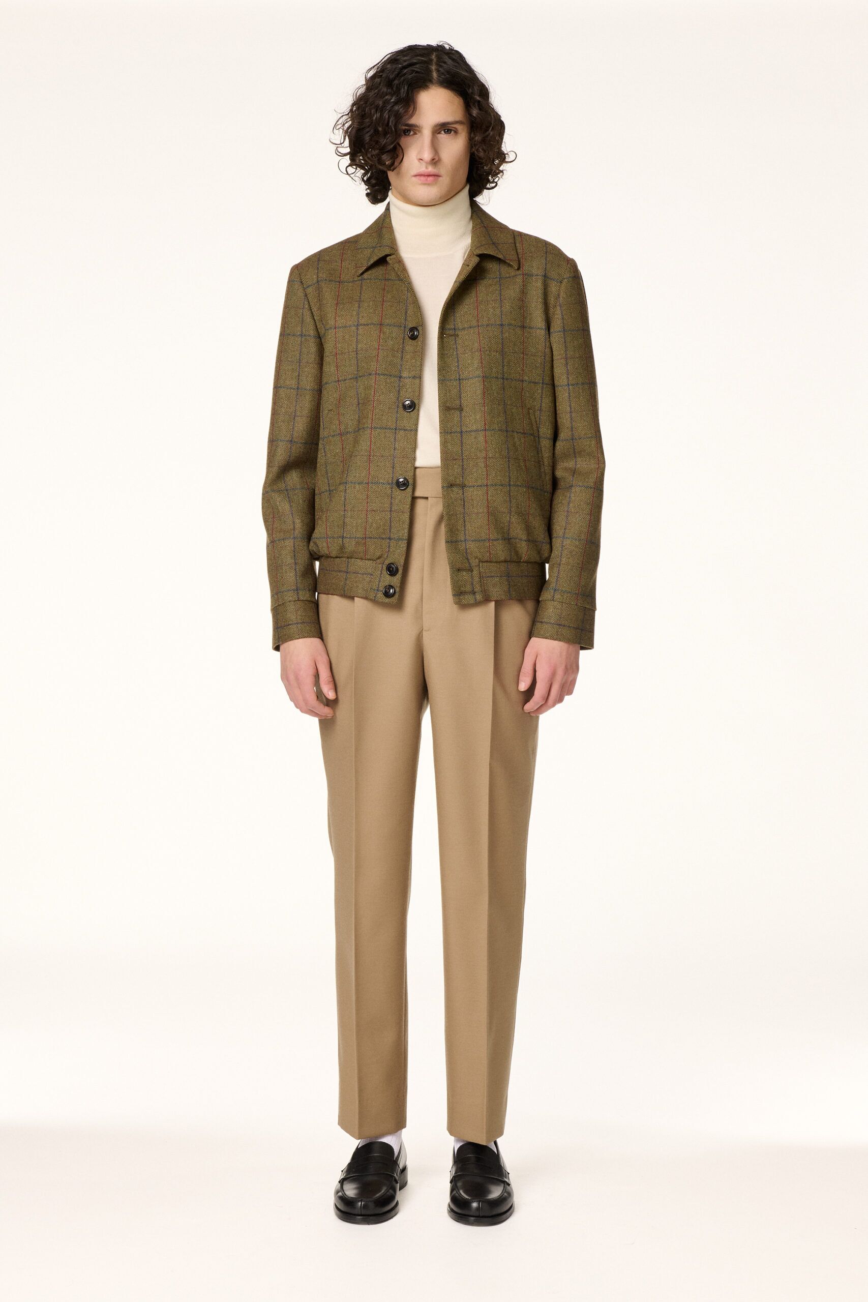 Pantalon réalisé dans une gabardine de laine italienne au ton camel. Conçu pour toutes les saisons, ce pantalon présente une coupe confortable, une taille haute, deux pinces sur le devant et un bas fini simple.