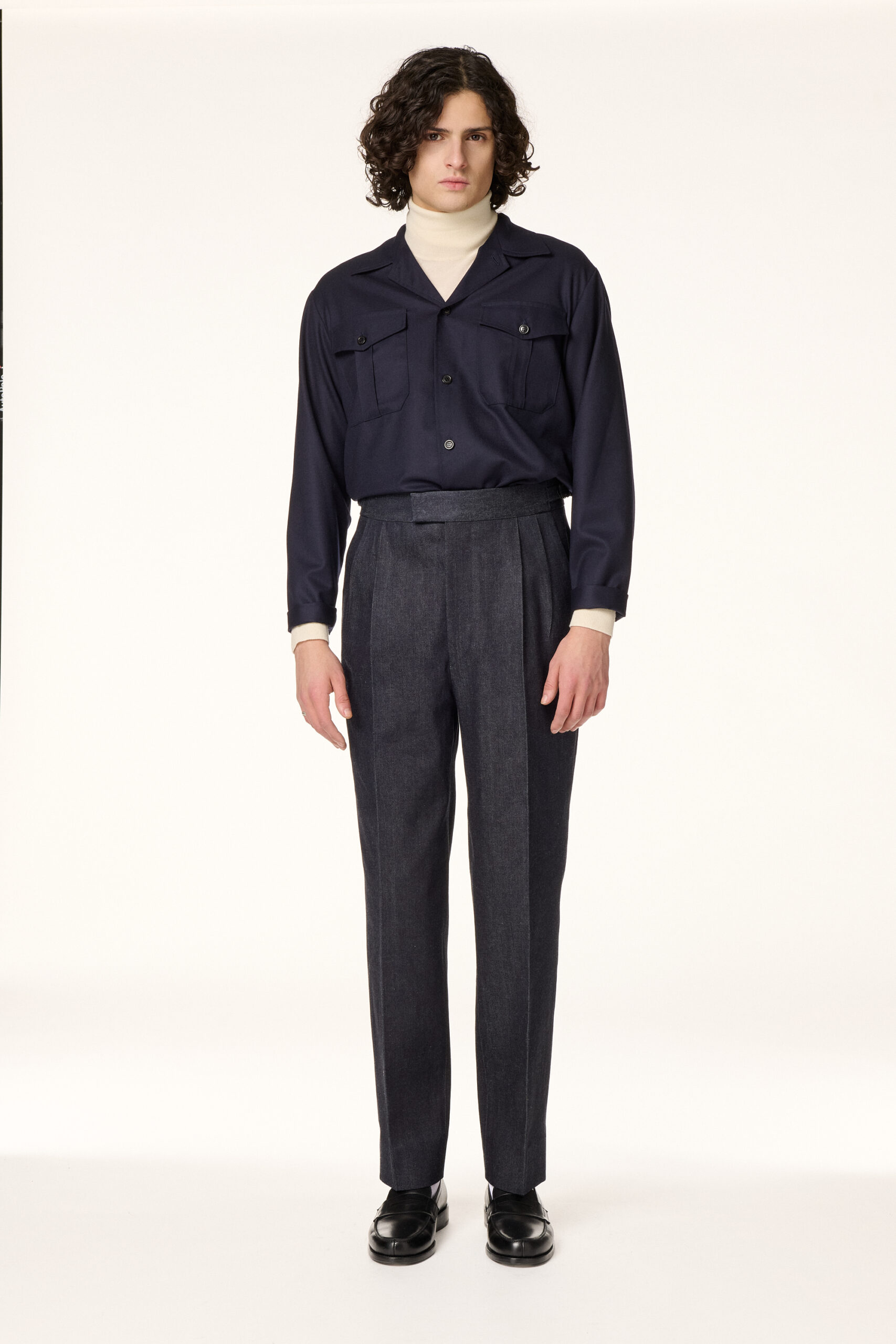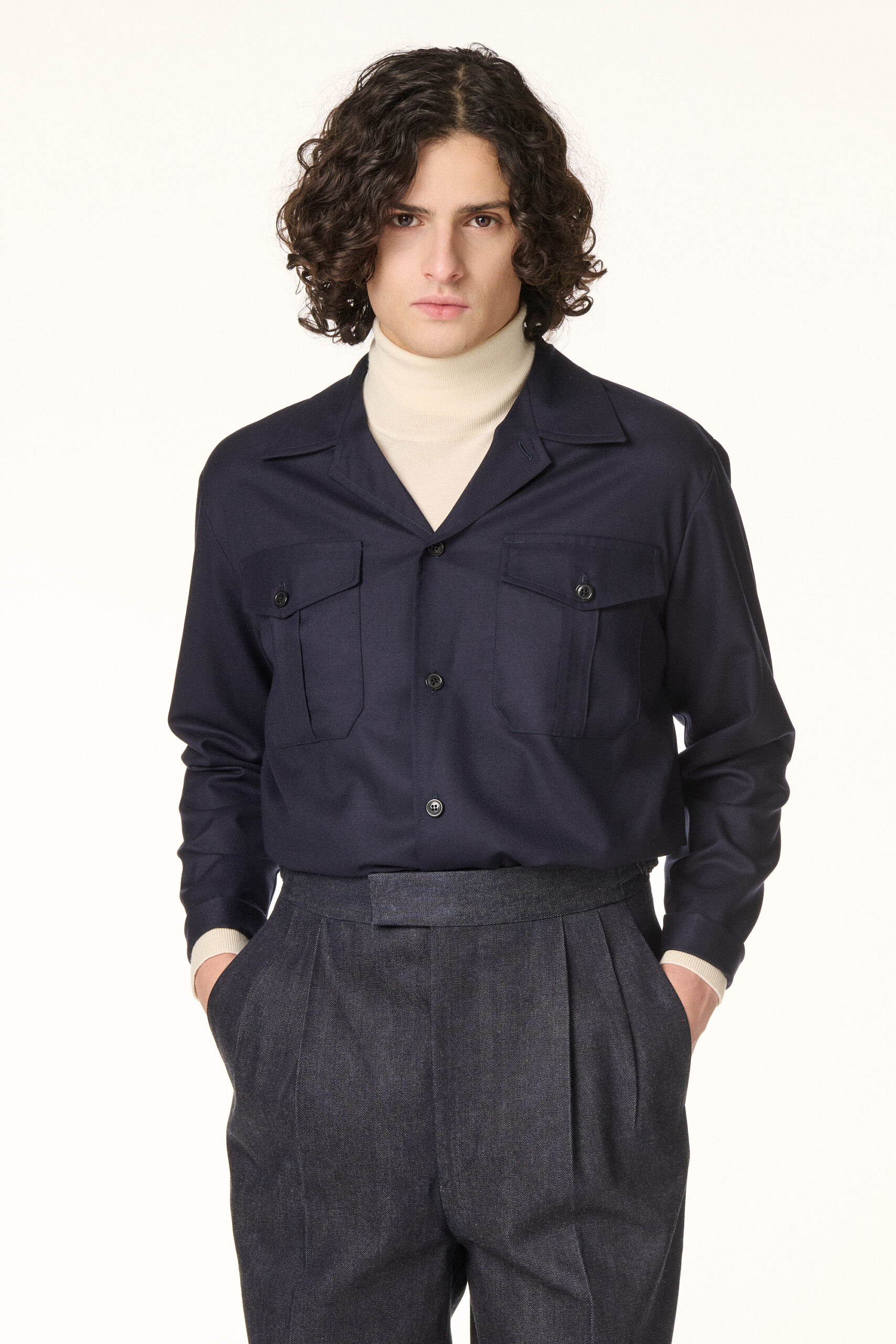 Sur-chemise réalisée dans une légère flanelle de laine italienne bleu marine. Inspirée du vestiaire militaire, elle présente une coupe droite, un col militaire, des poches poitrine à rabats, des manches longues sans poignets et une fermeture par boutons en corne.