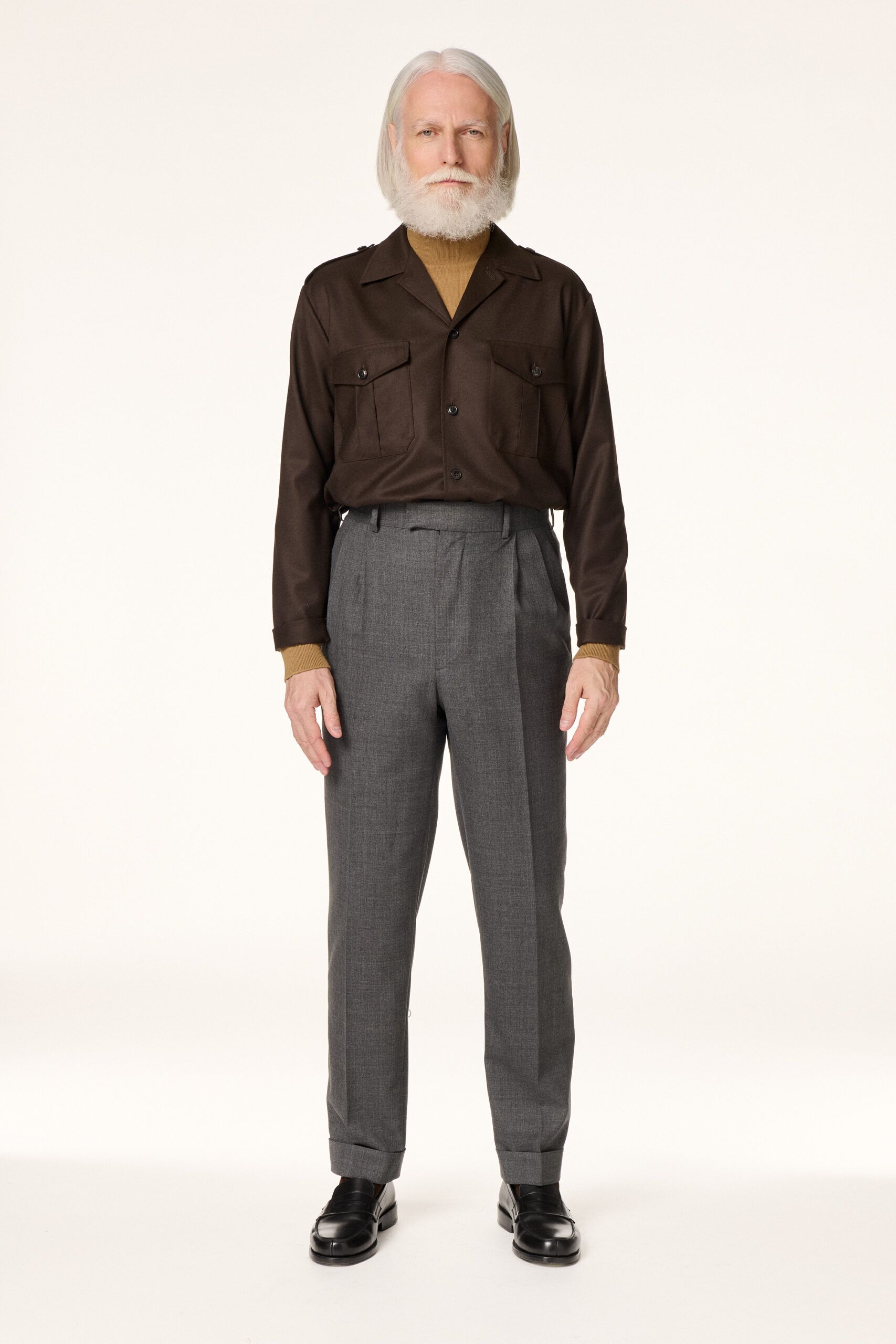 Sur-chemise réalisée dans une légère flanelle de laine italienne marron. Inspirée du vestiaire militaire, elle présente une coupe droite, un col militaire, des poches poitrine à rabats, des manches longues sans poignets et une fermeture par boutons en corne.