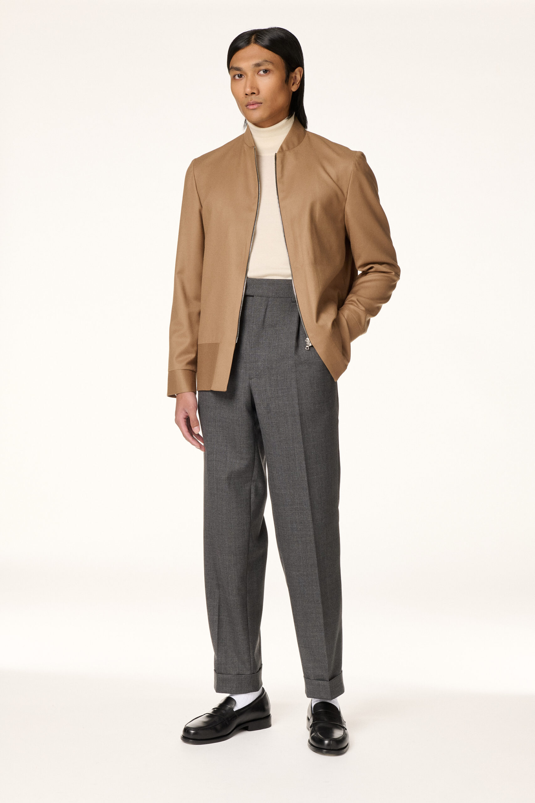Bomber réalisé dans une flanelle de laine légère, dans une teinte camel.