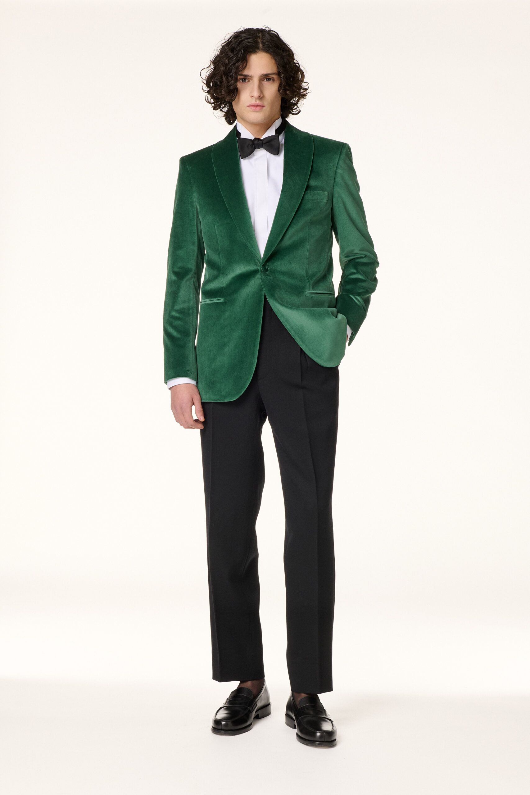 Veste de smoking réalisée dans un velours anglais au ton vert émeraude. De coupe droite, elle présente un col châle roulotté, une fermeture par un bouton recouvert de tissu et des poches passepoilées.
